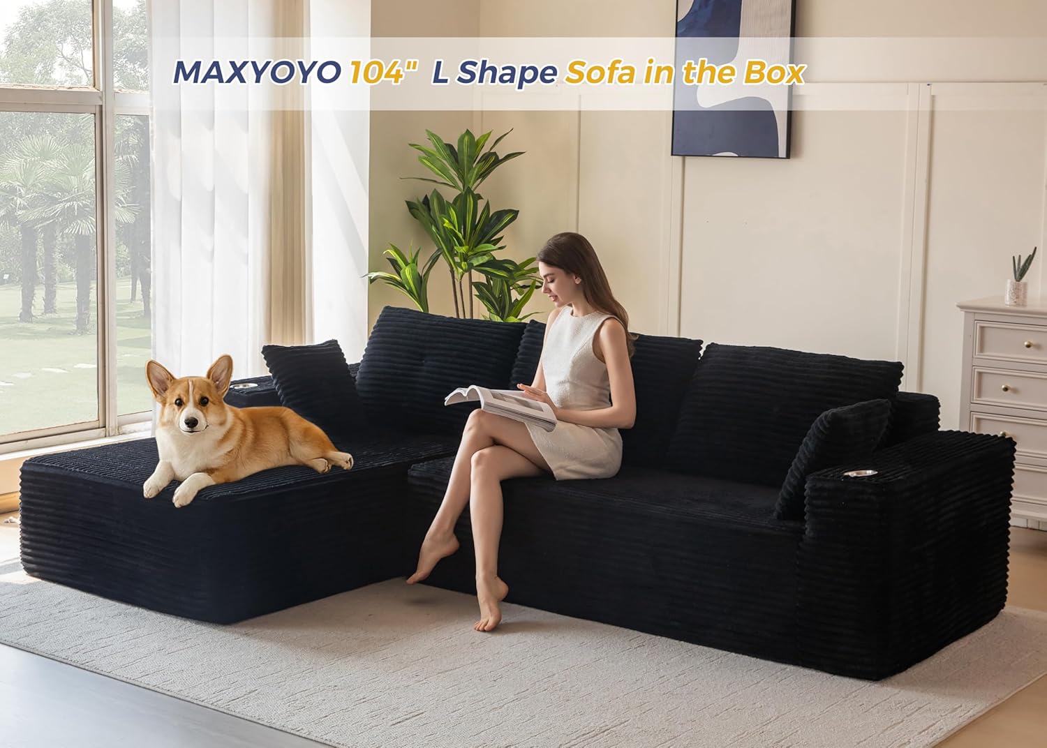 Oversized Sectional Sofa: The total width of the boneless sofa is 104 inches, which means unlimited possibilities of luxurious space for family movie watching, gathering with friends, or spending time alone, and the size of the L-shaped section allows for a natural stretching of the legs to be transformed into a sofa bed for an afternoon nap