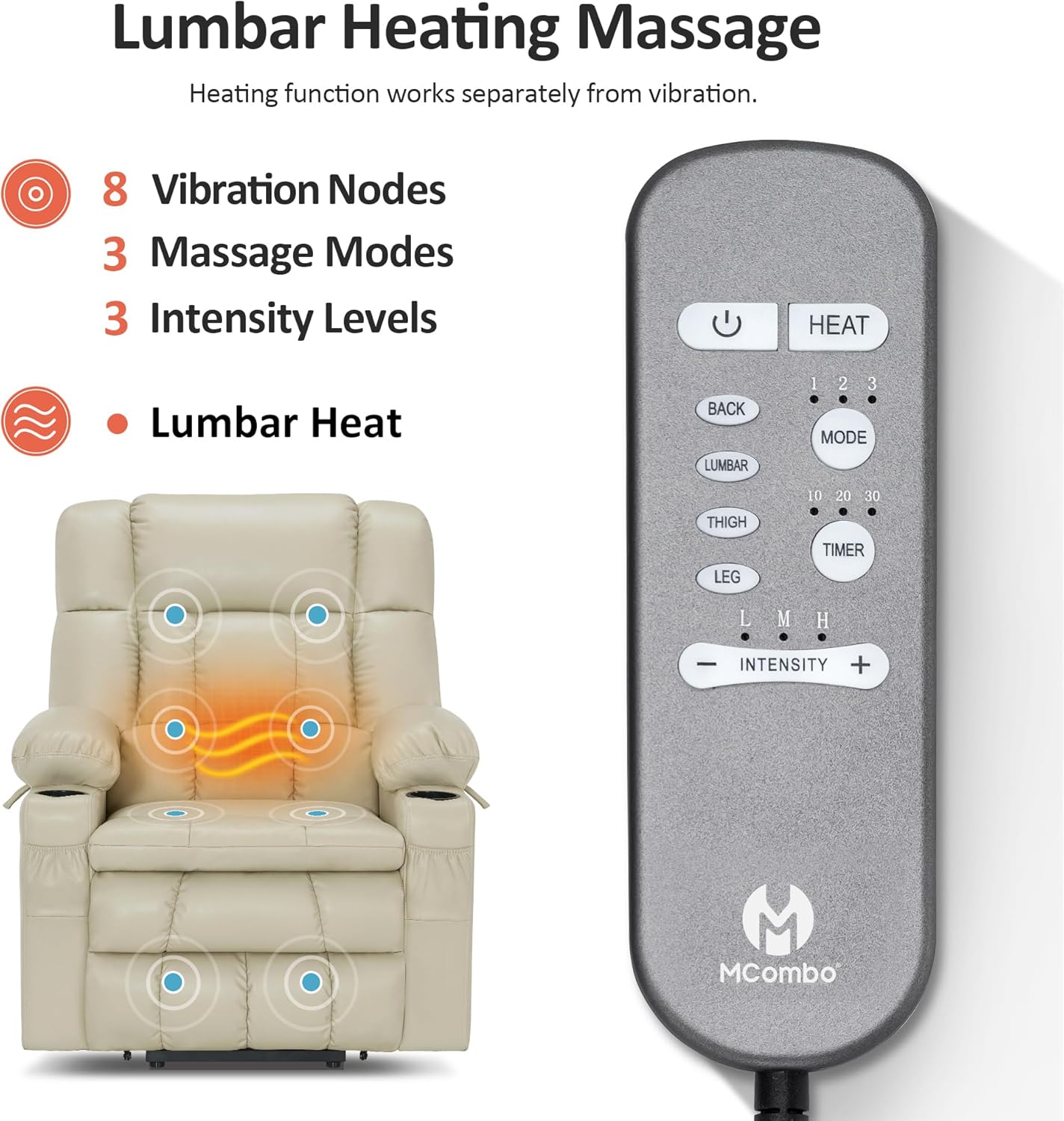 Full-body Vibration & Lumbar Heating. It comes with 8 vibrating points around the chair and 1 lumbar heating point. And the massage function can be turned off at a fixed time of 10/20/30 minutes (Heating function works separately from vibration)