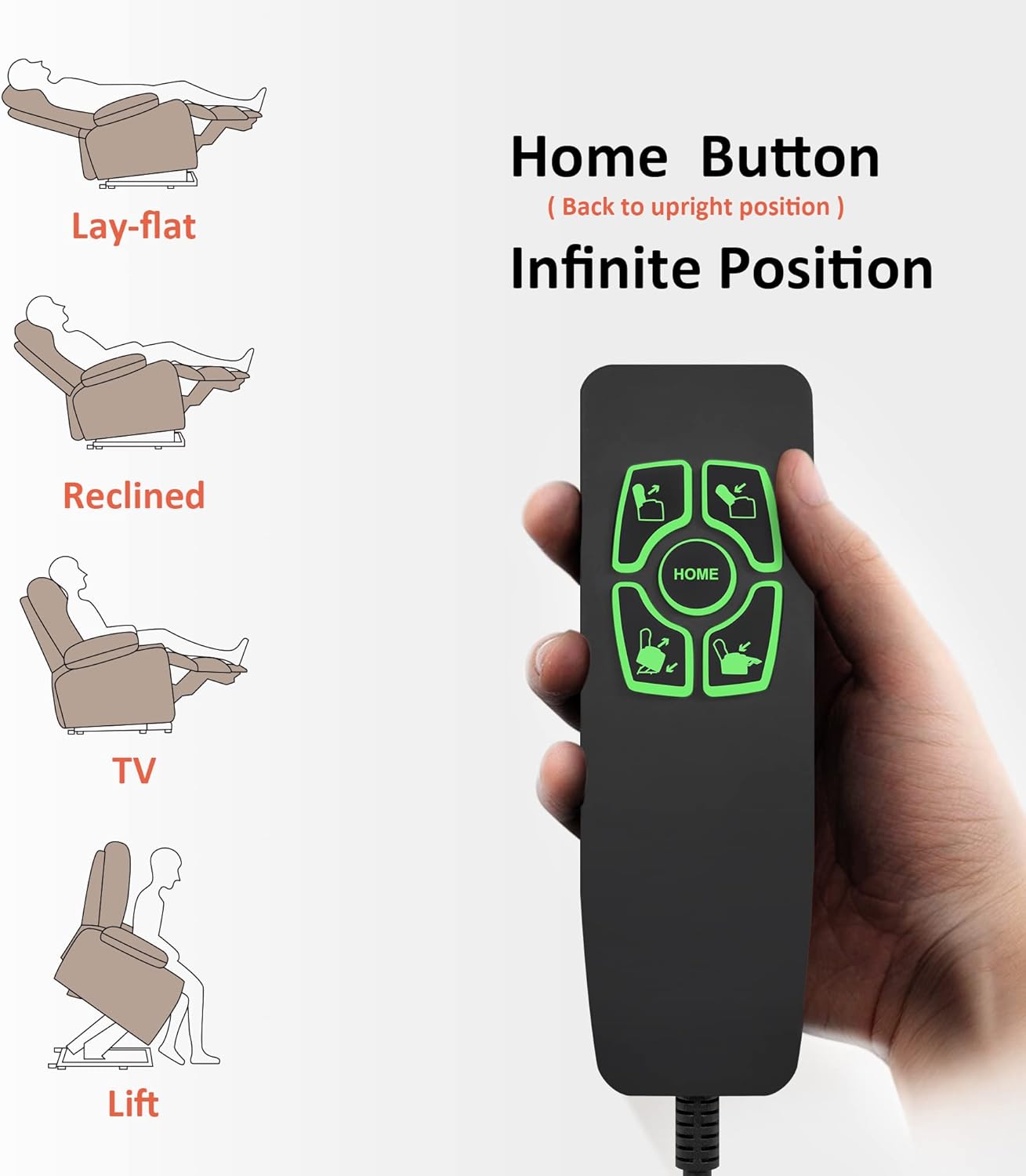 Home Button. When someone knocks on the door, you only need to press the HOME button on the remote control and you will return to the upright position in a maximum of ''16'' seconds. When the reclining position is raised, the back will move first to ensure your safety