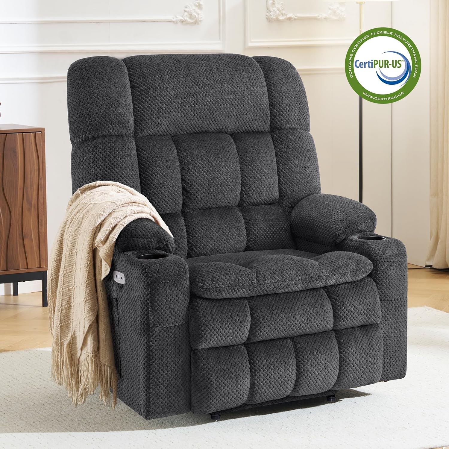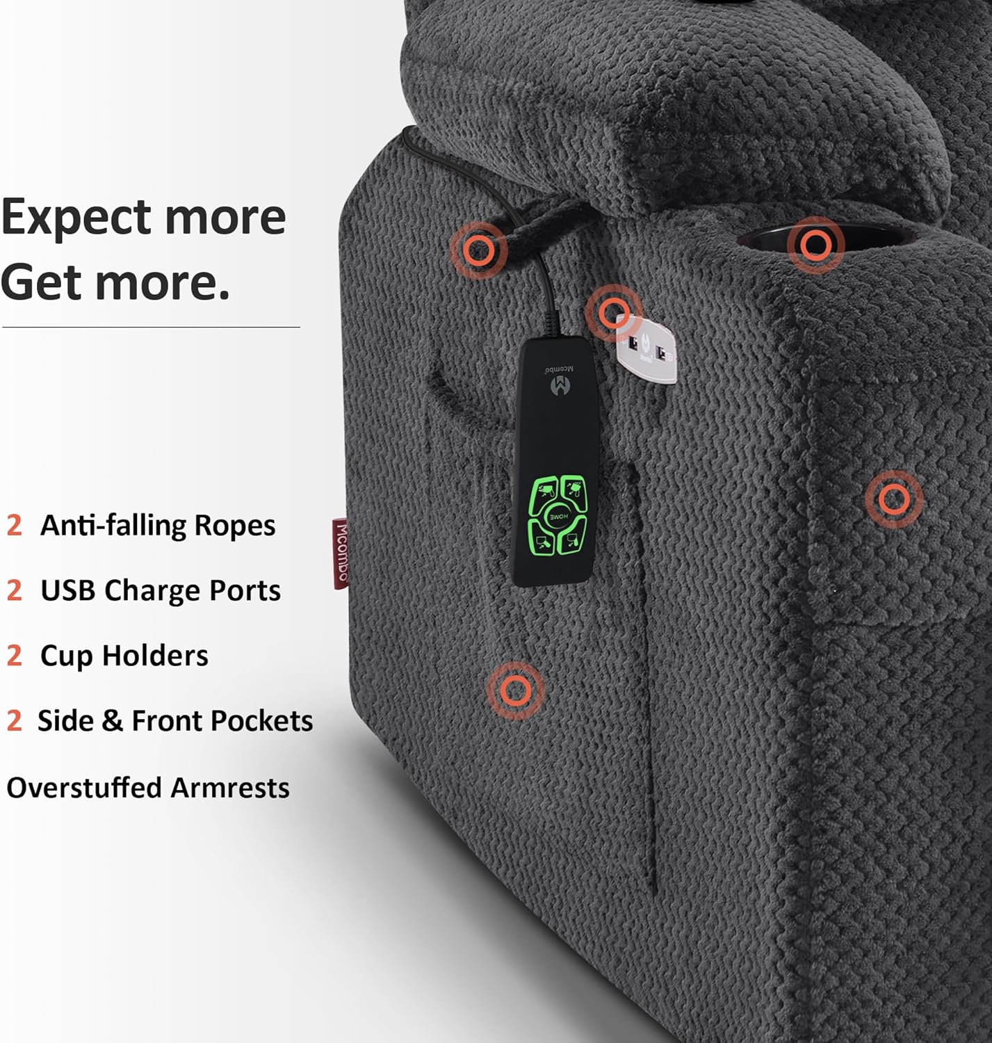 USB Charging Ports & Cup Holders: The dual USB ports and cup holders in the recliner will allow you to put your drink on the cup holder and charge your mobile devices all while enjoying a movie or enjoying your favorite apps