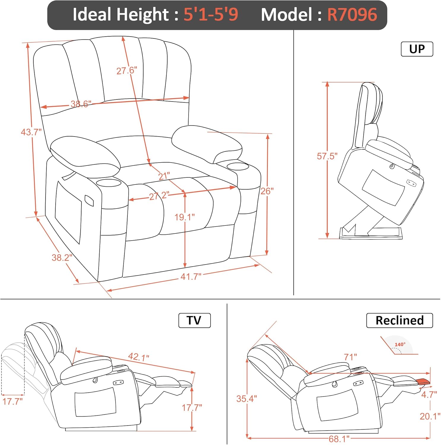 Multiple Sizes, Perfect Comfort: The comfort of your chair depends on how well it fits your body. Our lift chairs come in multiple sizes to perfectly match your body type. If you desire extra seating space or have a pet that likes to lie in your lap or beside you, our 27.2" wide seat designs are here to meet your needs. (Recommended Height: 5'1"-5'9")
