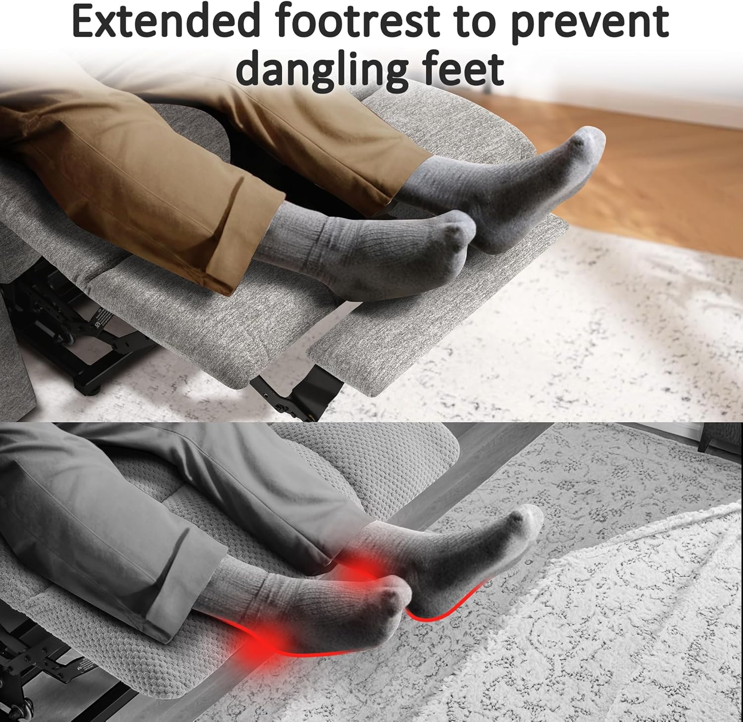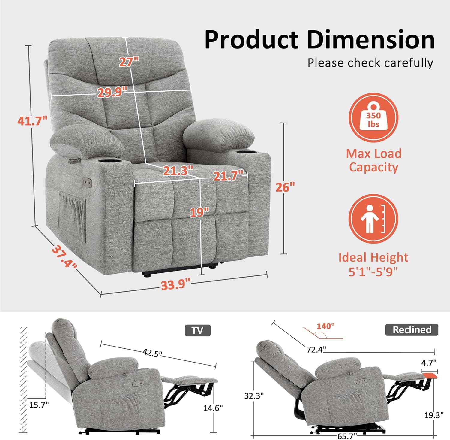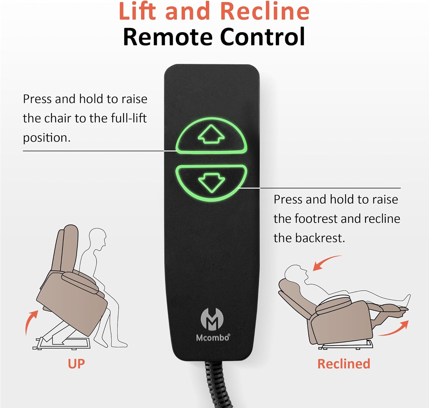 Power Lift Assistance: Counter-balanced lift mechanism to assist the senior stand up easily, smoothly adjust to lift or reclining position you prefer by pressing buttons (Max reclining angle: 140)