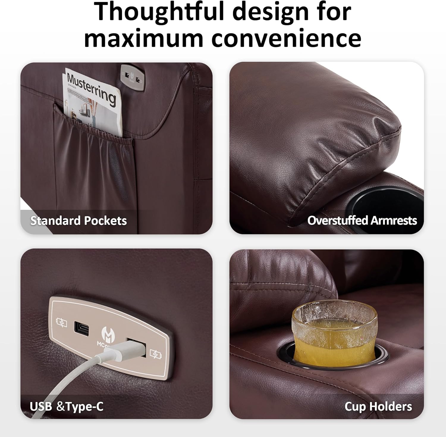 Convenient Everyday Features: Includes a 3.9" deep cup holder, two charge ports (USB & Type-C), and multiple storage pockets, keeping drinks, devices, and essentials within easy reach
