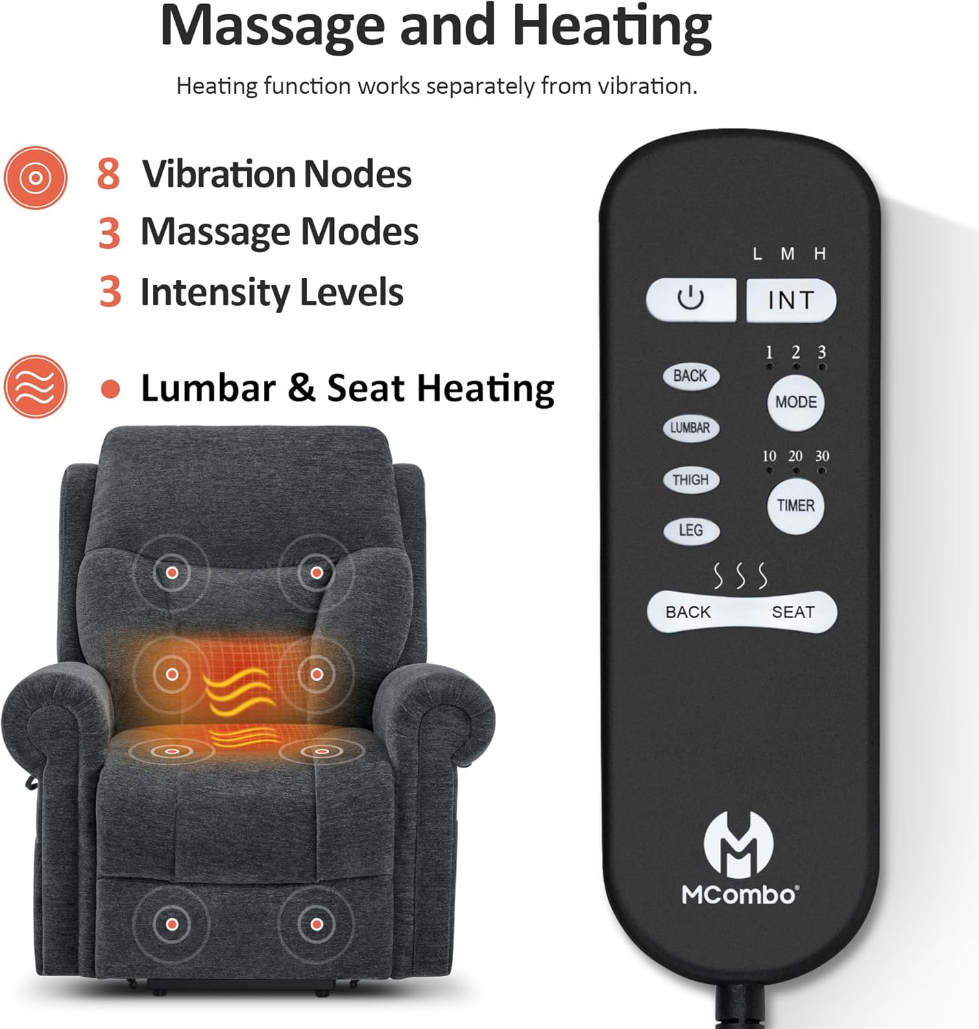 Lumbar & Seat Heating: After analyzing the heating needs of our customers, we added heating functions to the backrest and base respectively. The heating function works separately from the vibrating function