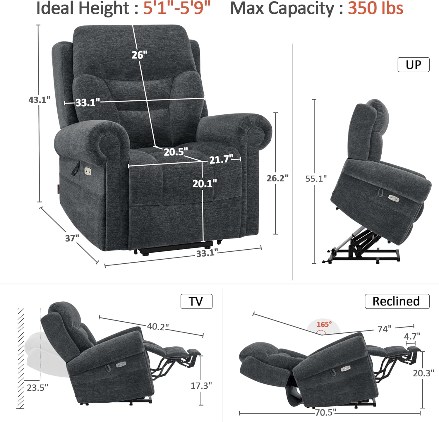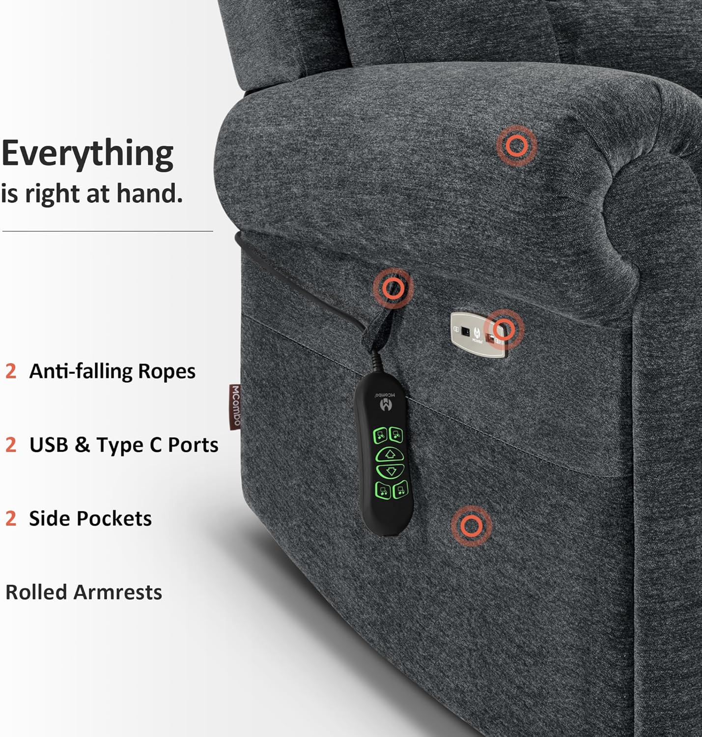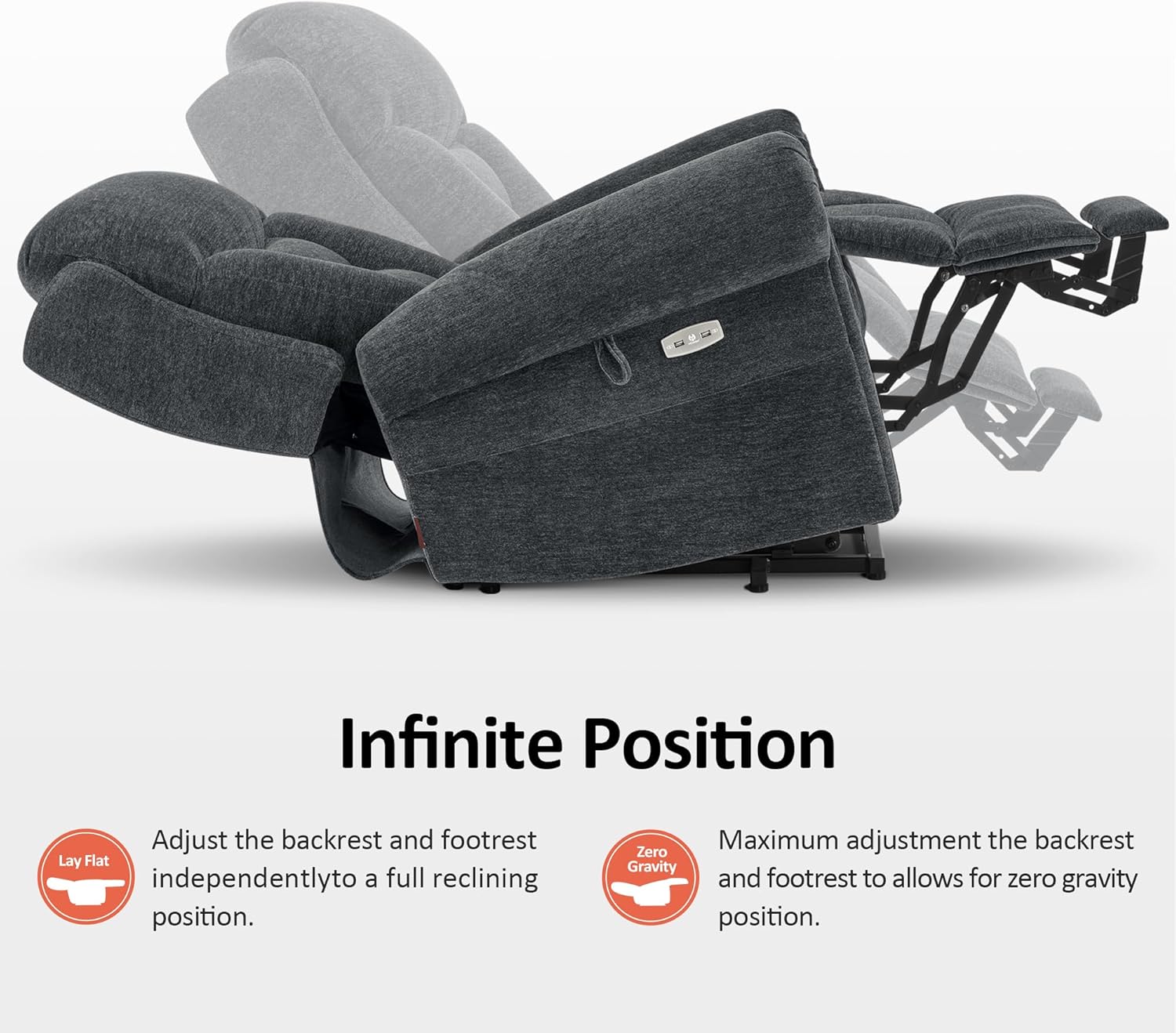 USB Charging Ports: The dual USB ports in the recliner will allow you to charge your mobile devices while enjoying a movie or enjoying your favorite apps