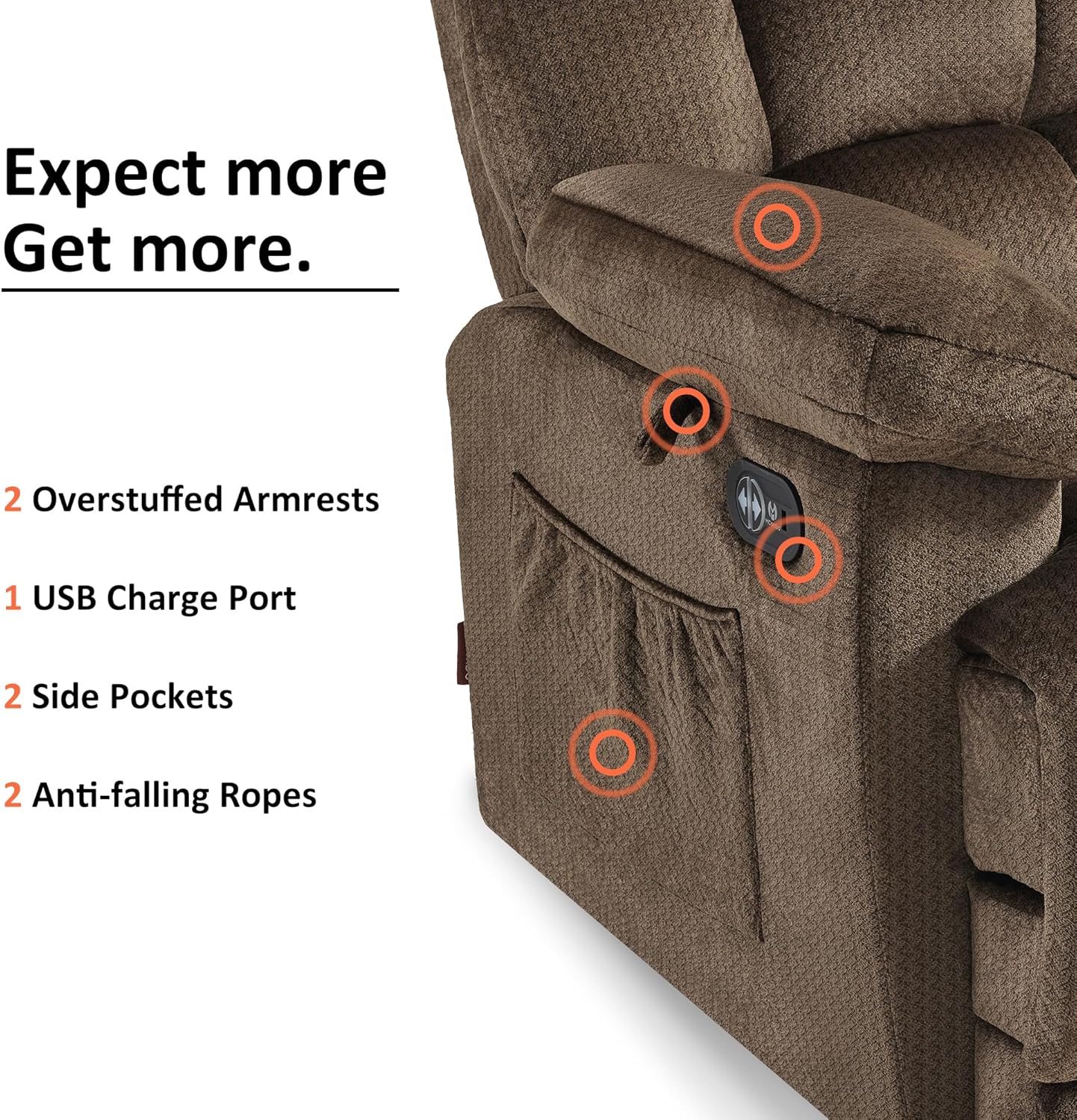 Convenience at Your Fingertips: The single sofa's armrest loop keeps essentials within easy reach. The USB charging port allows you to power devices without getting up