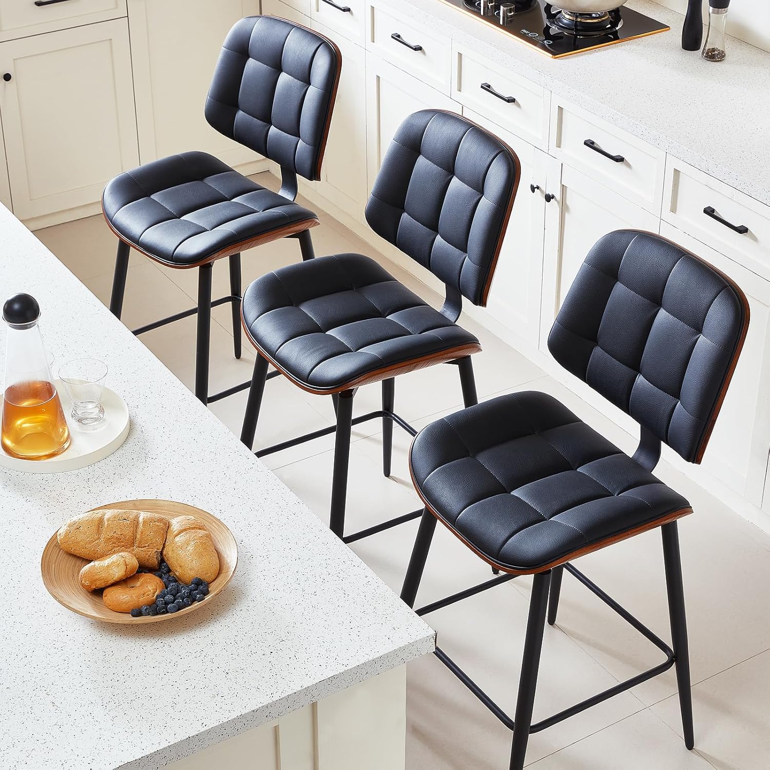 Comfortable Seating Experience Both the cushion and backrest are filled with high-resilience foam, paired with an ergonomic curved seat that fits your spine perfectly. This counter stools gently supports your waist and back for fatigue-free long sitting. Finished with classic grid quilting, this design not only brings a timeless retro aesthetic but also distributes pressure evenly across the surface, effectively preventing sagging from prolonged use.