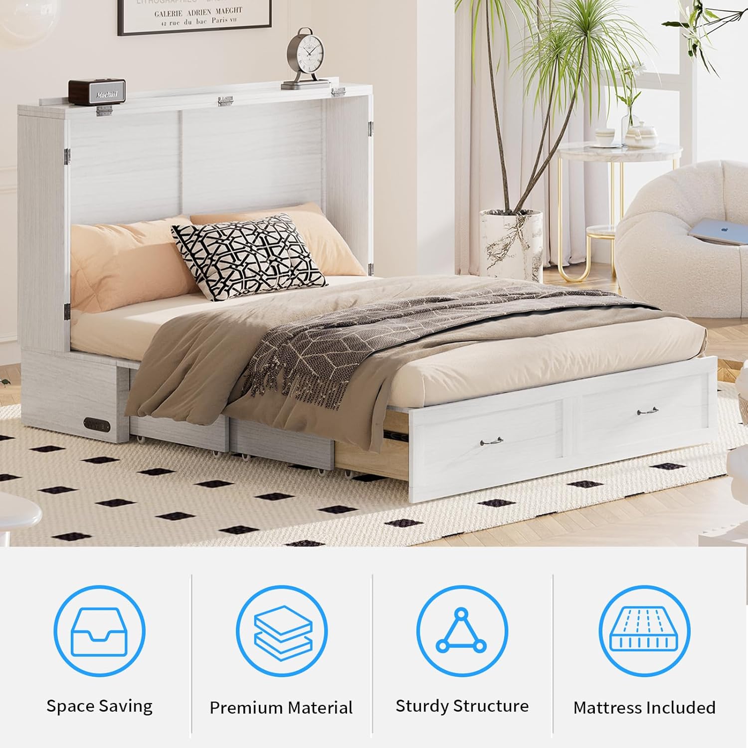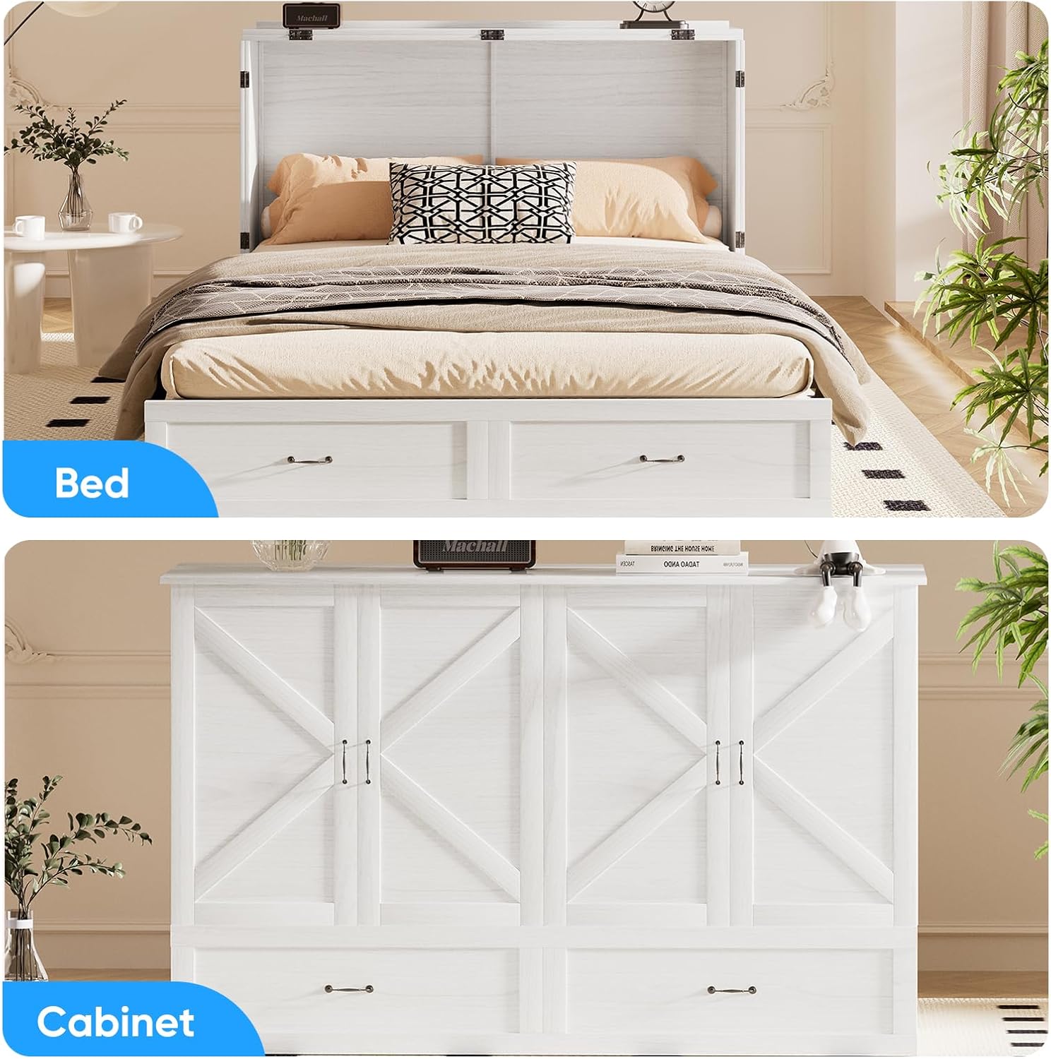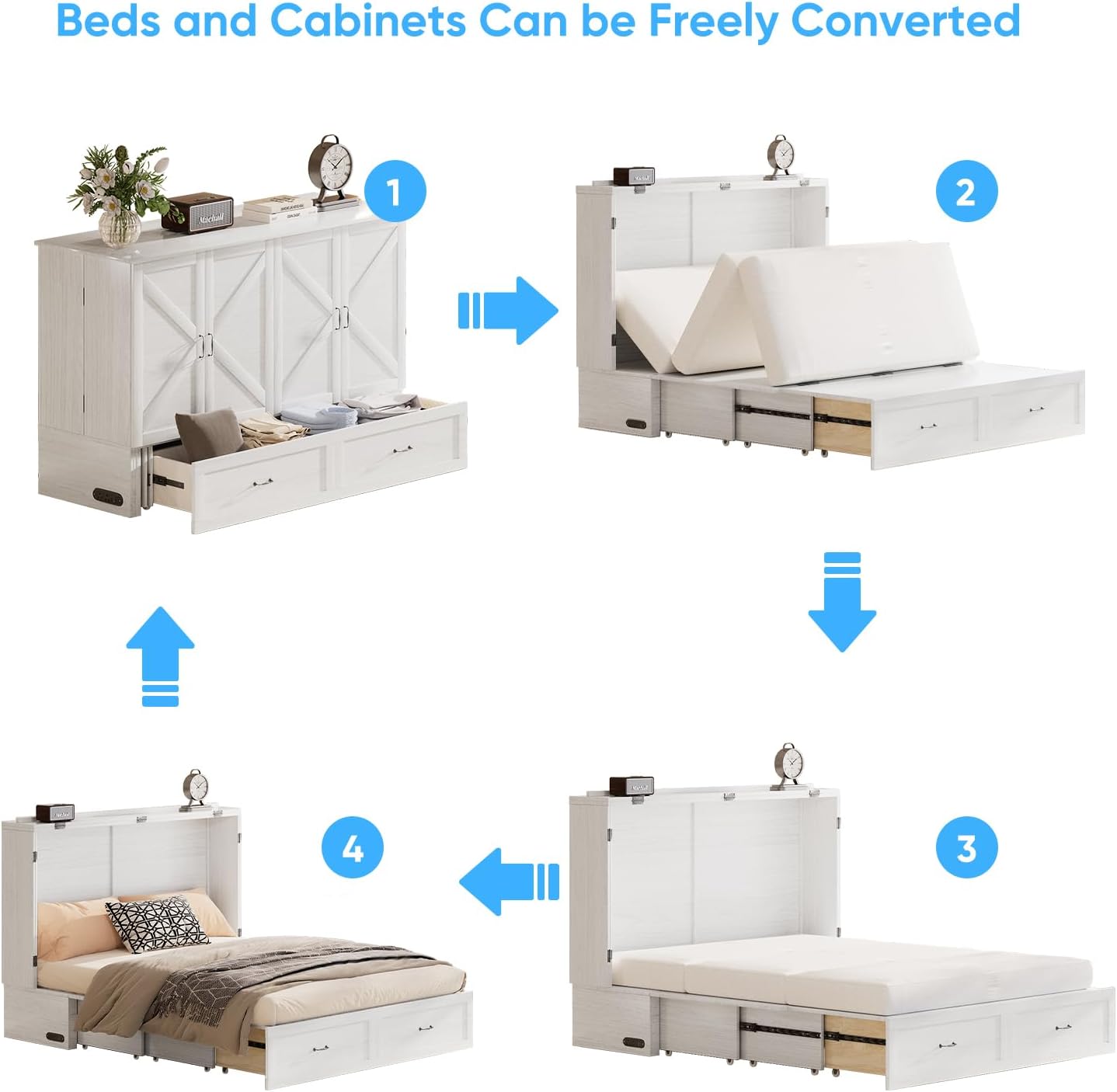 Declutter instantly! 2 jumbo drawers store bedding/clothes/gadgetsworks in bed/cabinet modeno dead space!Full storage during conversionsno capacity loss! Space-saving essential for tiny homes/dorms/studios.