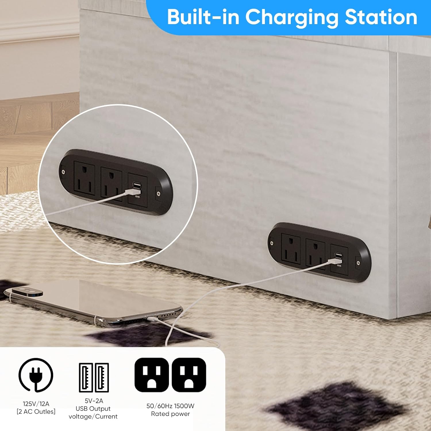 Built-In Charging Station (USB & AC Outlets)Integrated charging station with 2 AC outlets and 1 USB portkeep your phone, lamp, or small devices powered overnight. Note: For safety, only for phones and small appliancesnot recommended for high-power devices.