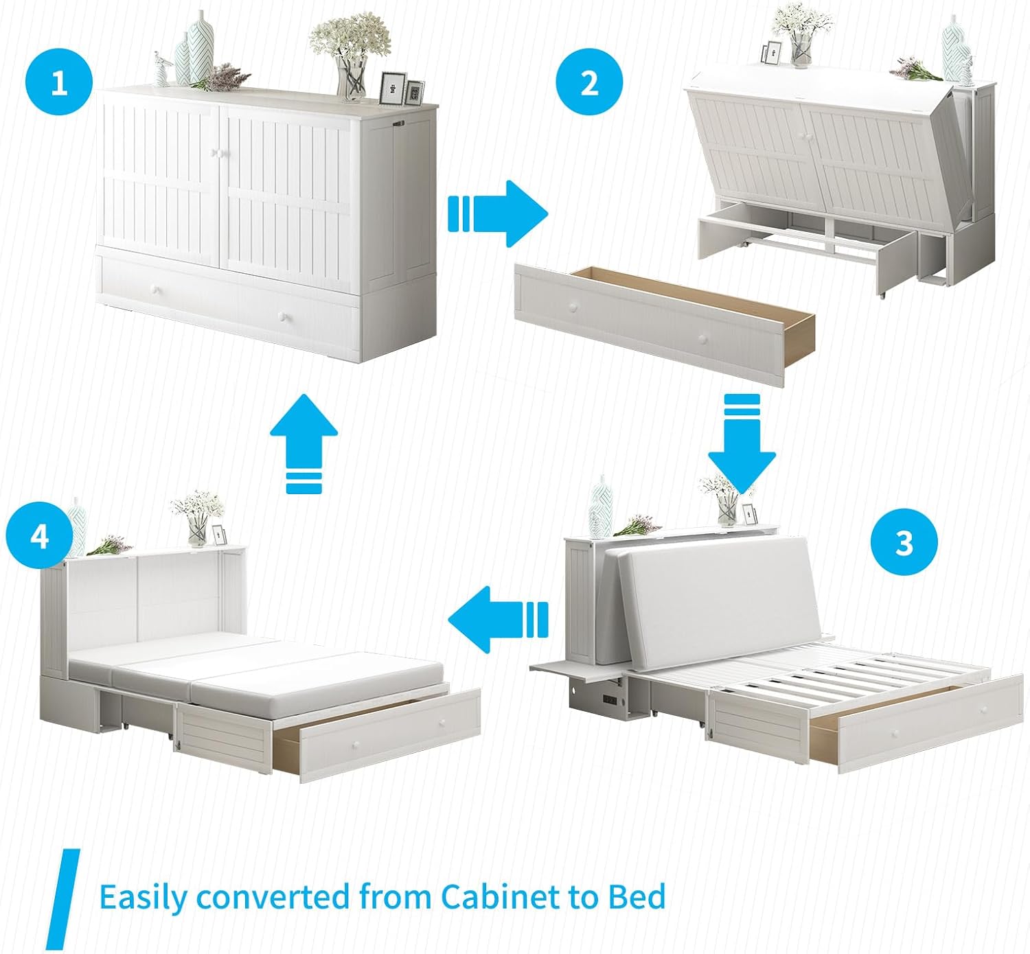 Space-Saving Design: When closed, the bed transforms into a sleek, compact cabinet measuring just 40.47H x 64.09W x 22.91D, freeing up room for activities, work, or entertaining. When open, it provides a queen-sized, comfortable sleeping area. The simple assembly process comes with clear instructions to ensure that you can quickly install this multi-functional new furniture in your bedroom, guest room or studio apartment.