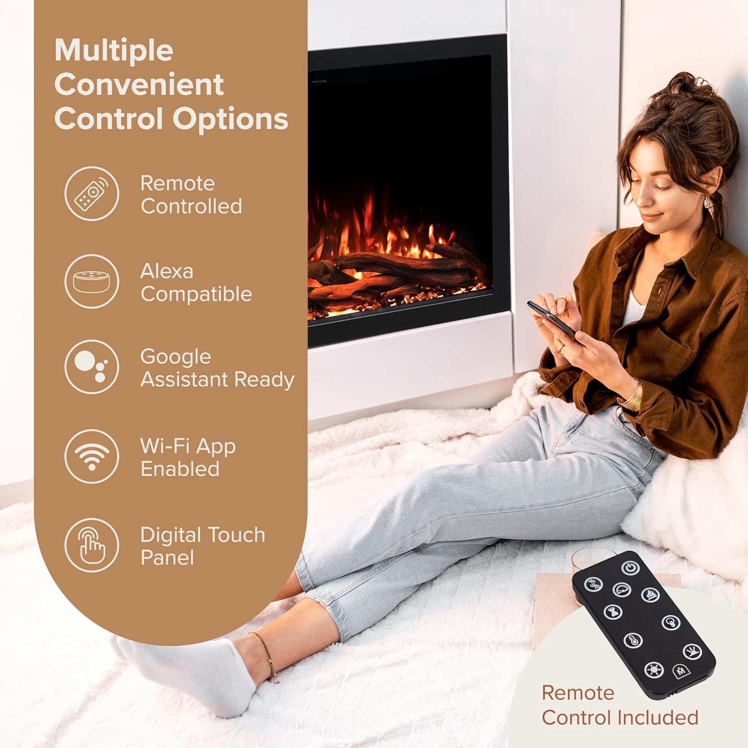 CONTROL HEAT YEAR-ROUND: Set the desired room temperature (64 - 82) or completely turn off the heat during the summer - The flames operate with or without the flames, so you control the ambience in the room.