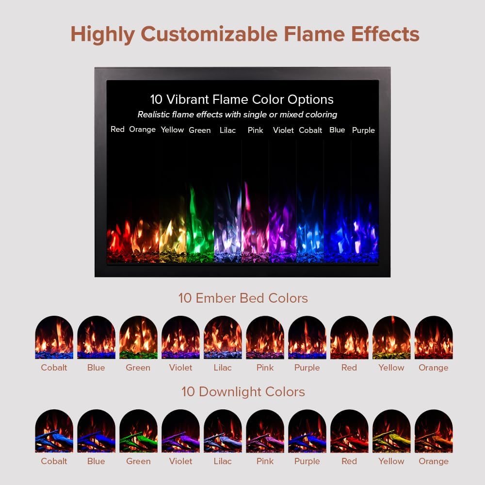 REALISTIC LOGS & EMBER BED: The included realistic-looking resin logs and crystal ember bed add to the realism of the fire and flames. Adjust the flames between 10 flame colors, 4 flame speeds, 5 brightness settings and 10 ember bed colors.