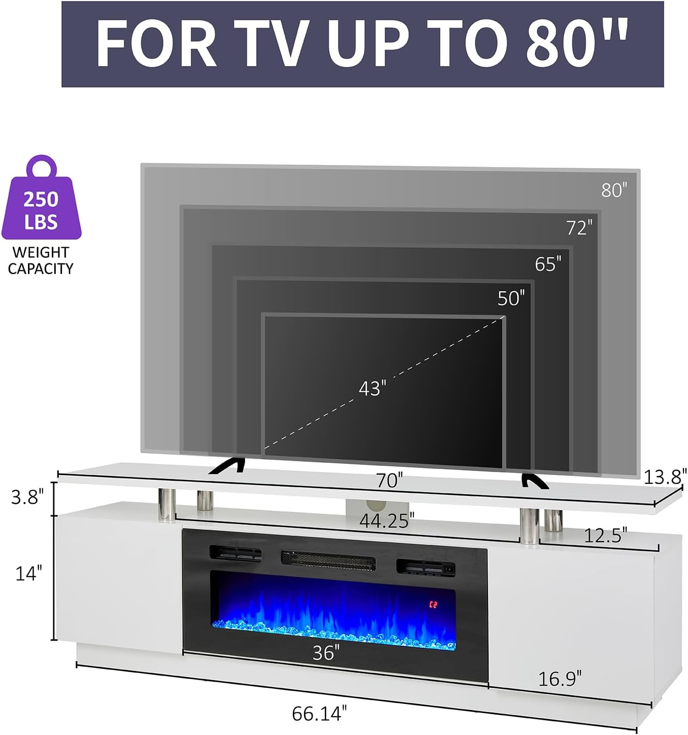 Dimensions & Load Capacity: Media console-70"W x 14"D x 23"H. Fireplace-36" W x 14" H. Max load capacity of the top is 250lbs. Black TV stand is suitable for TVs up to 80".