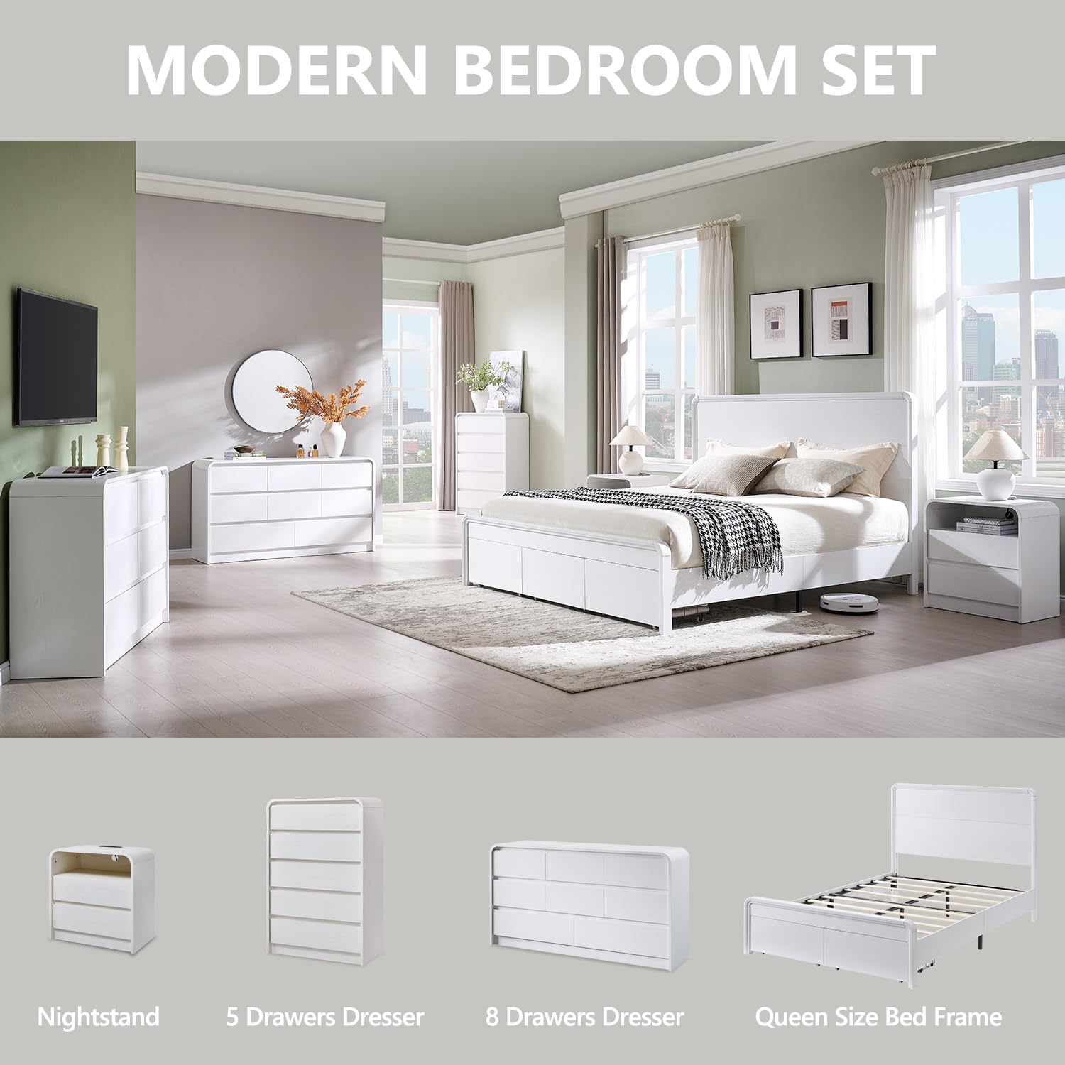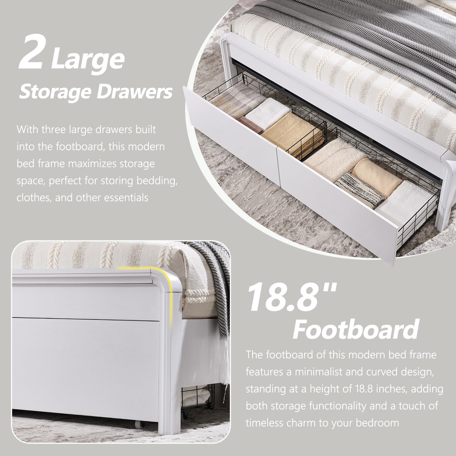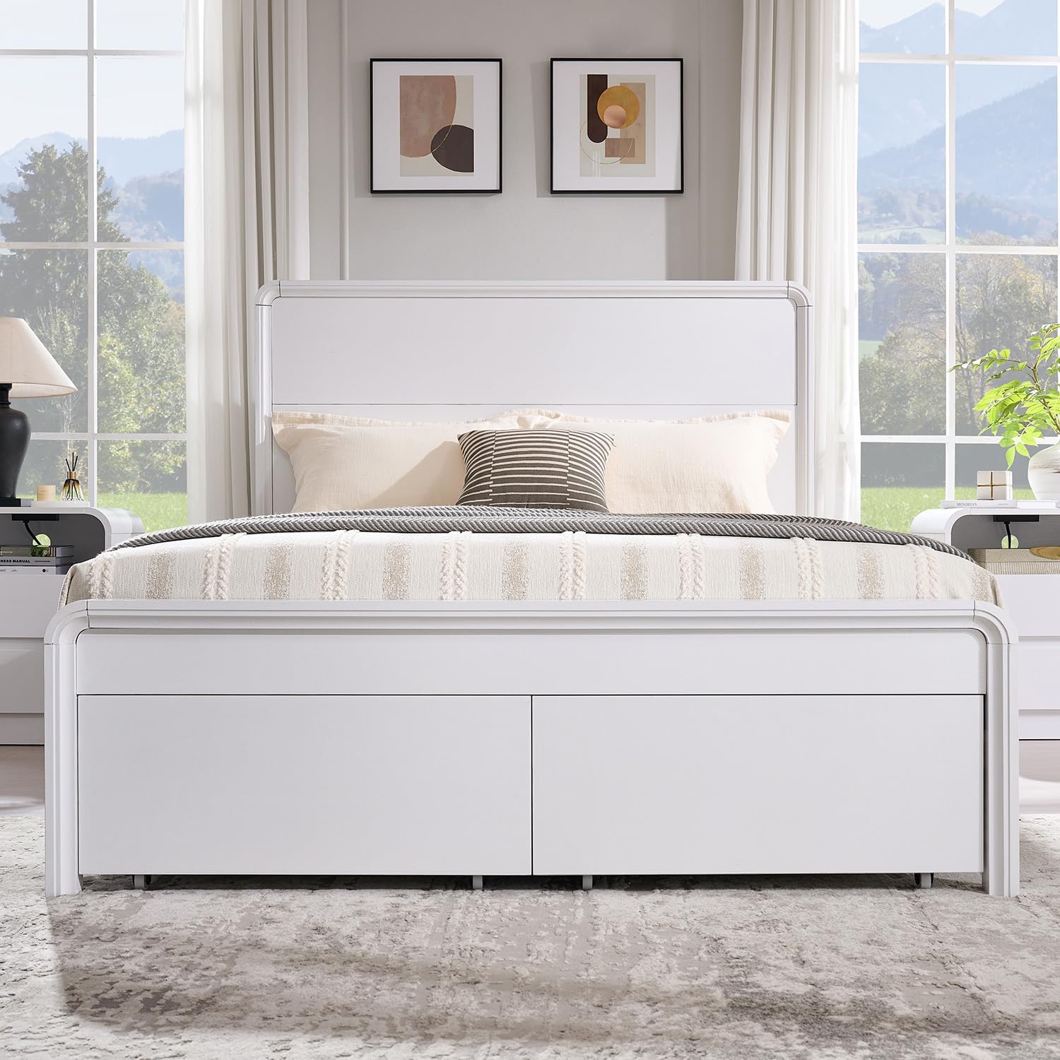 MODERN CURVED DESIGN: Our queen size bed showcases a unique curved design that blends elegant lines with a smooth, textured surface for enhanced visual appeal and modern aesthetics. Smooth rounded corners and handle-less drawer design simplify the look while providing ease of everyday use and added security, adding warmth to your home. Complementing both modern and classic styles, this versatile wood Queen size bed will be the highlight of your bedroom