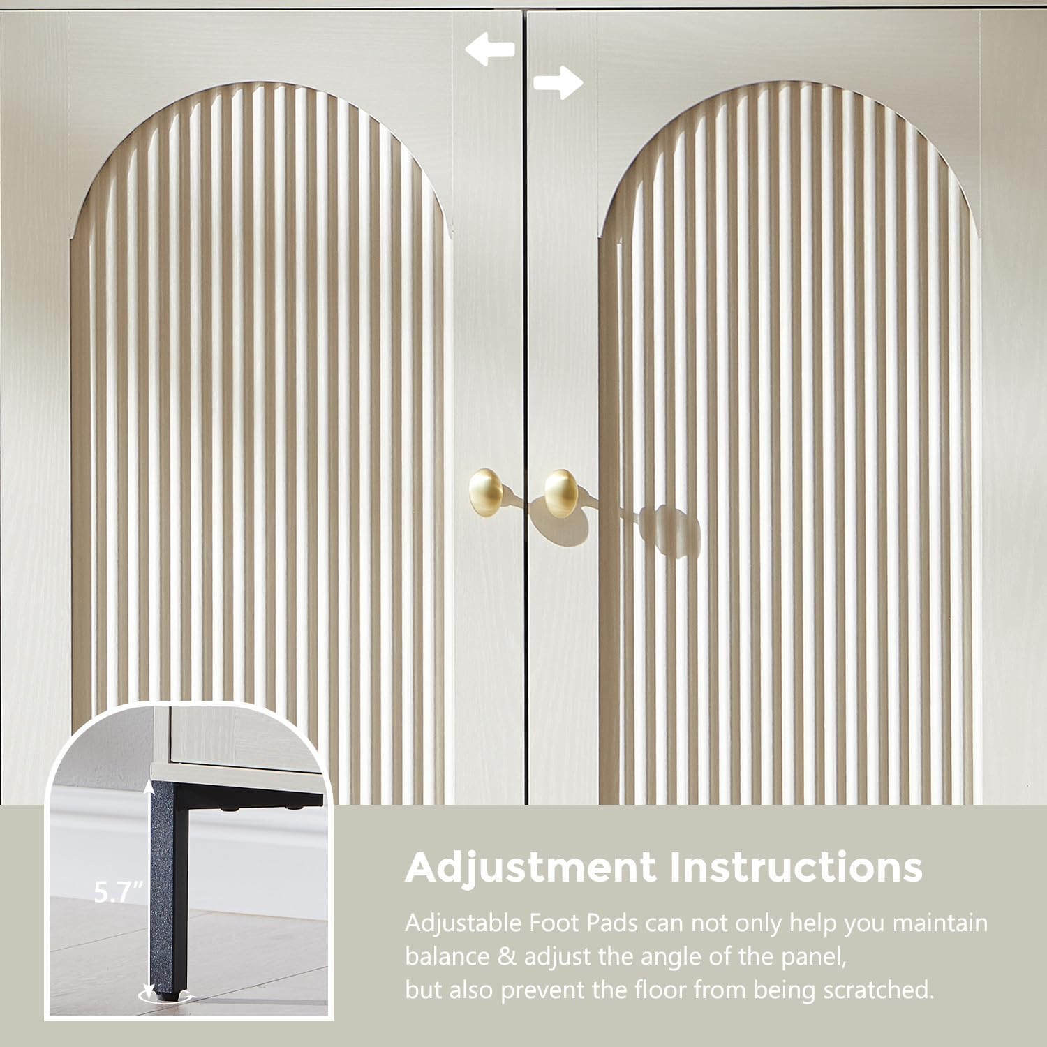 Elegant Symmetrical Fluted Arched Cabinet Wood Entertainment Center features meticulously carved arched fluted panels that create captivating light and shadow effects, adding a touch of modern artistry to your living space. This mid-century modern storage cabinet not only boasts exquisite aesthetics but also offers a delightful tactile experience. It effectively resists fingerprints and minor scratches, maintaining a pristine appearance with ease