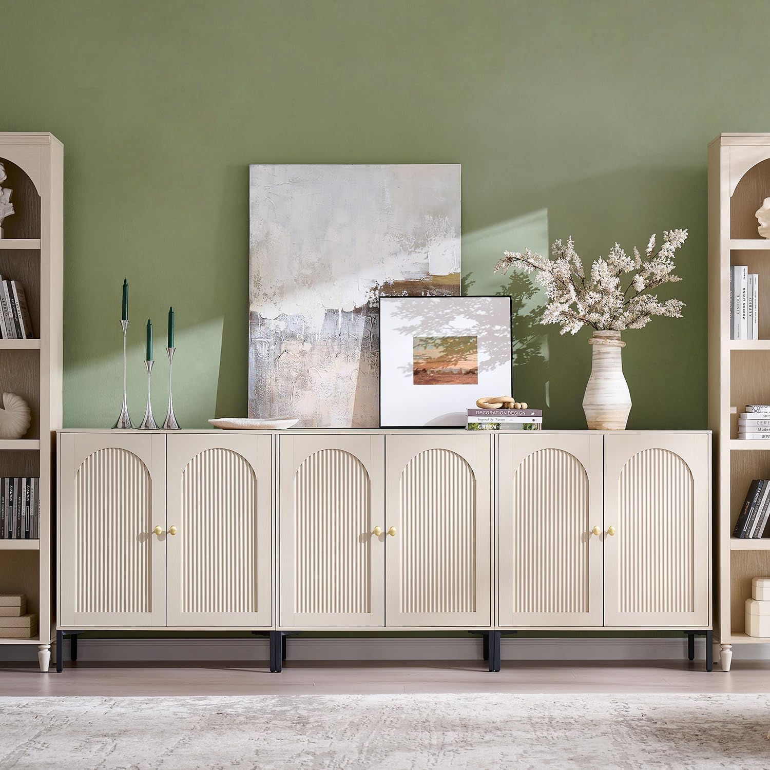 • Modern TV Stands for 80 Inch TV, 92.63" W Wood Entertainment Center w/Adjustable Shelves, Mid Century Modern TV Stand w/Arched Fluted Doors, Media Console Cabinet for Living Room, Cream