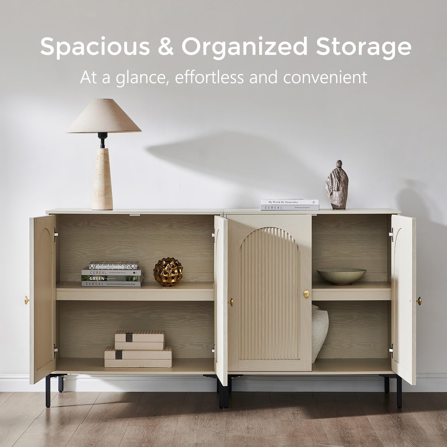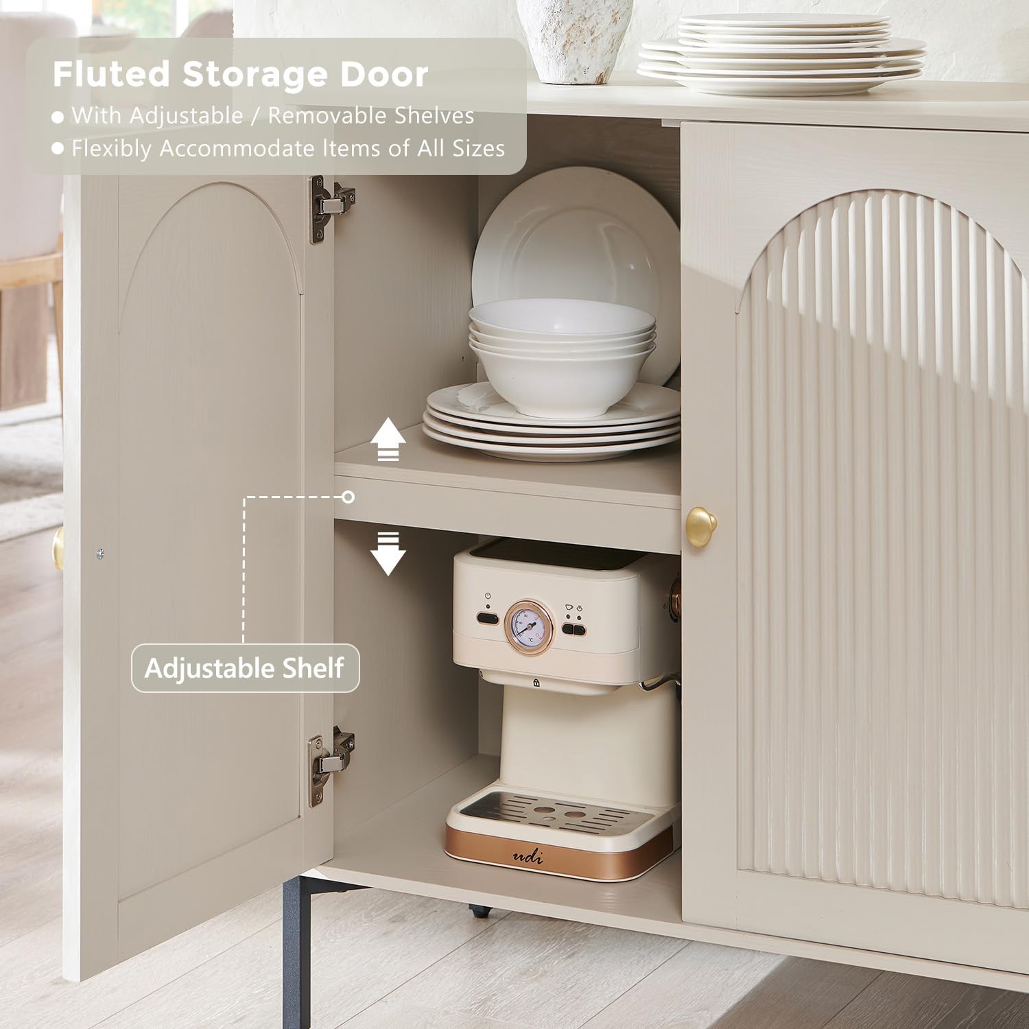 Adapts to Any SpaceThis accent sideboard cabinet is adaptable to various rooms, serving as tv stands for living room& a serving station during meals, a display area for decorations, or a storage unit. Whether for your dining room, living room, entryway, or hallway, it functions as a sideboard, kitchen storage cabinet, TV console, or coffee bar, meeting diverse storage and display needs while enhancing the room's functionality and aesthetics