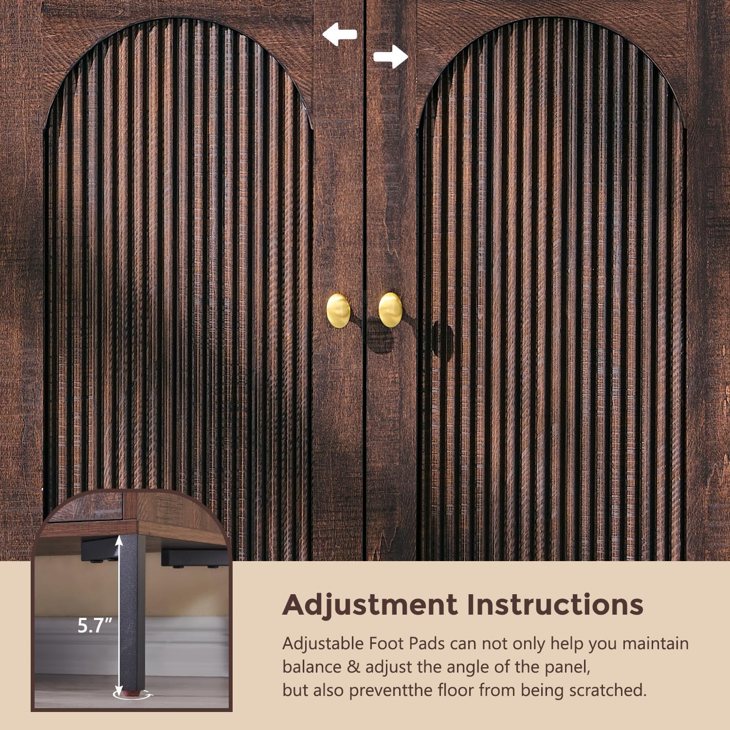Elegant Symmetrical Fluted Arched Cabinet Wood Entertainment Center features meticulously carved arched fluted panels that create captivating light and shadow effects, adding a touch of modern artistry to your living space. This mid-century modern storage cabinet not only boasts exquisite aesthetics but also offers a delightful tactile experience. It effectively resists fingerprints and minor scratches, maintaining a pristine appearance with ease