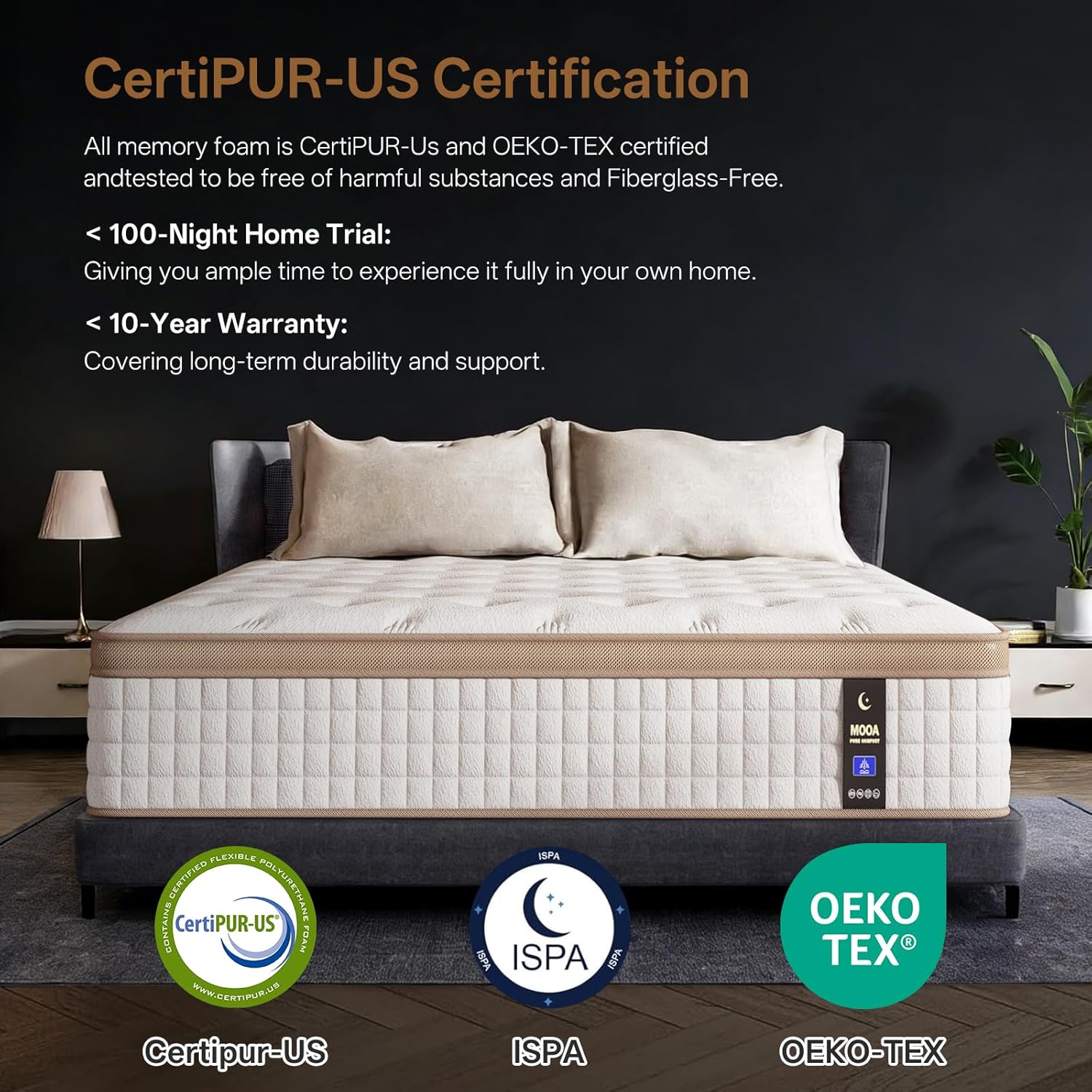 CertiPUR-US Safe, Fiberglass-Free: The queen mattress is certified by both CertiPUR-US and OEKO-TEX for verified material safety, long-lasting durability, and low VOC emissions. A flame-retardant cotton barrier meets CFR 1633 U.S. safety standardsproviding advanced fire protection without using fiberglass or harsh chemicals.