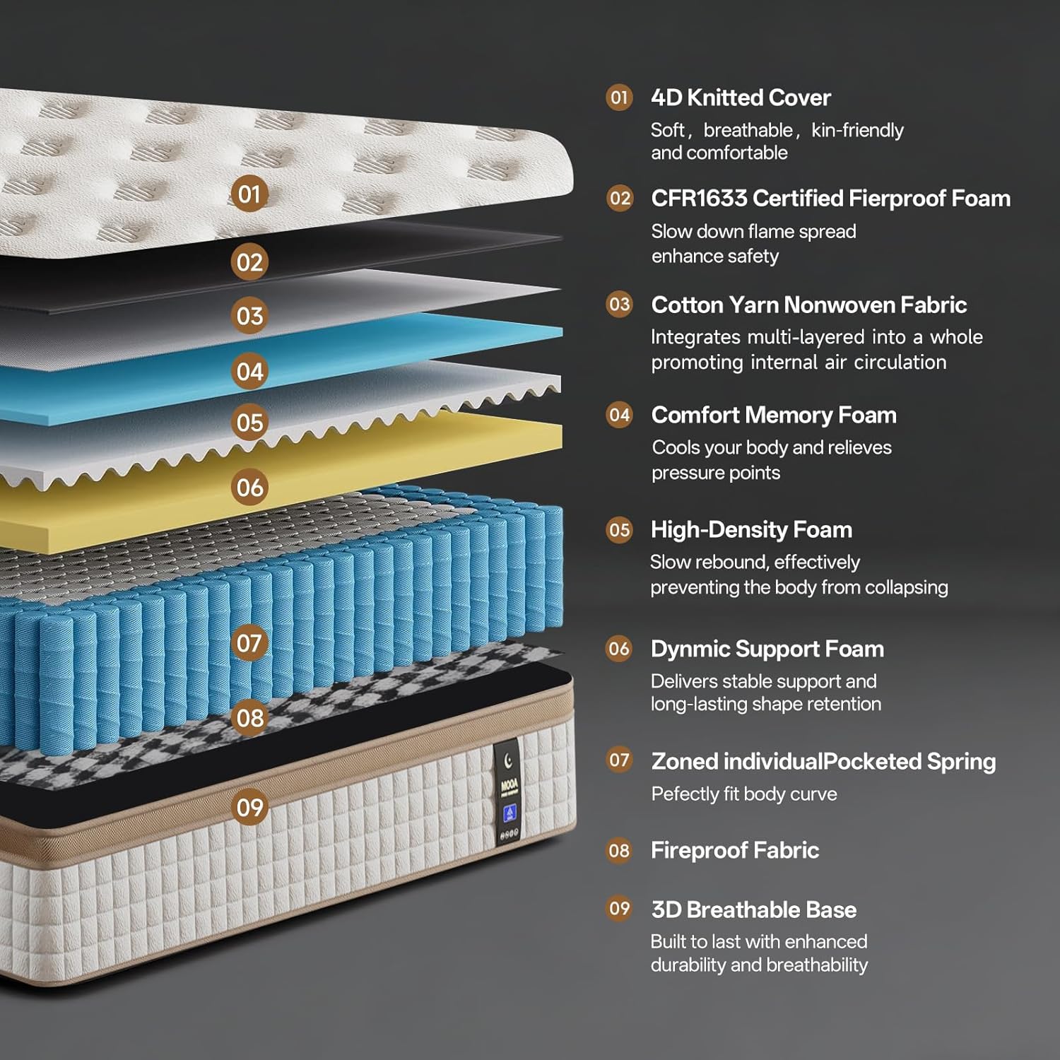 Cooling Comfort Hybrid System: (1) The hybrid queen mattress's a 4D knitted cover + 3D breathable base enhance ventilation (2) Open-cell copper-infused memory foam (3) Hundreds of individual pocket springs create open channels that allow heat to escape and fresh air to circulate. This system sleeps up to 4F cooler than traditional hybrids, with moisture-wicking performance tested to remove 83% of nighttime perspiration.
