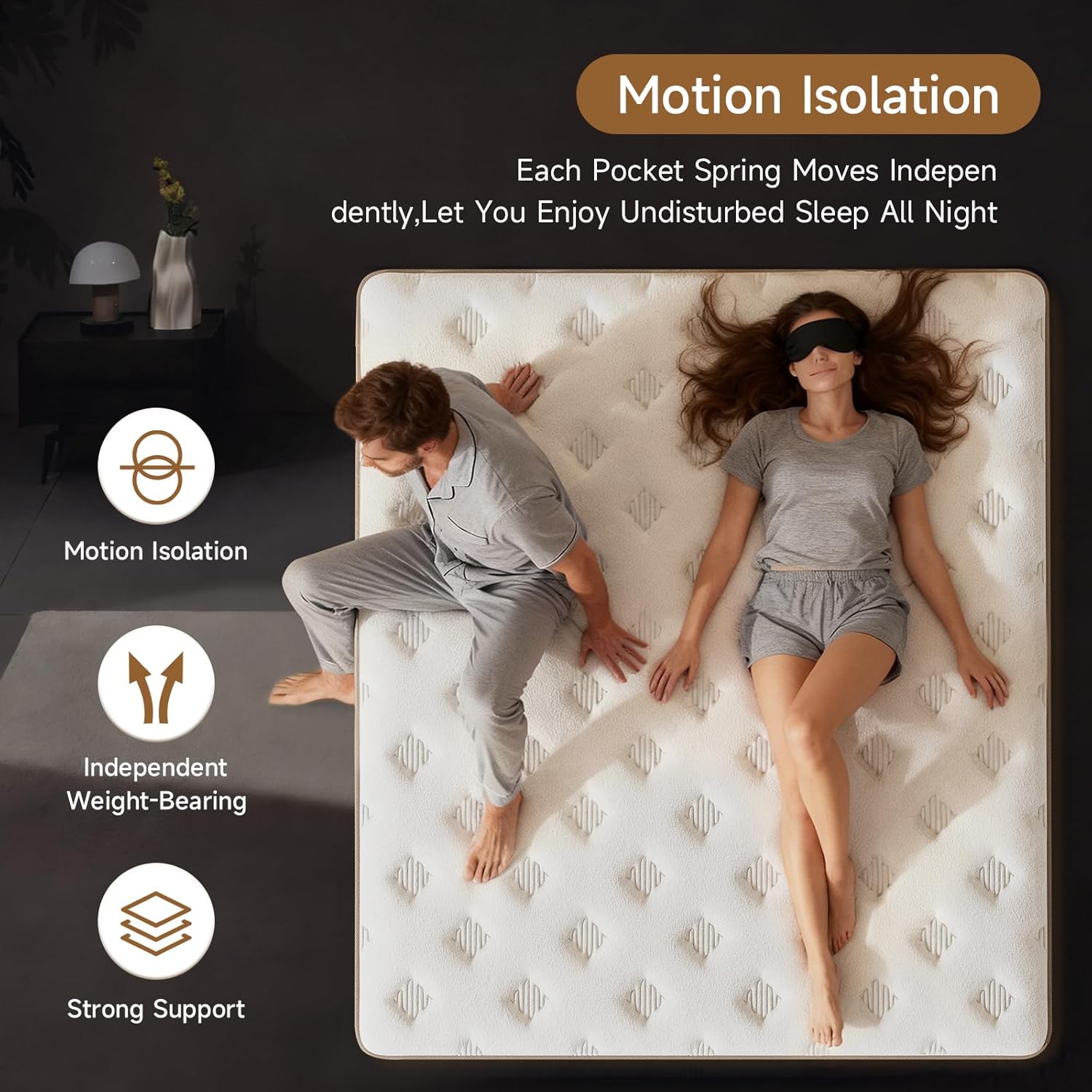 Quiet Sleep, Motion Isolation: The 12 inch hybrid queen size mattress uses upgraded independent pocket springs, each of which provides personalized support for optimal spinal alignment and excellent motion absorption. Improve sleep quality and minimize tossing and turning. At the same time, it effectively absorbs the noise generated when your partner turns over or gets in and out of bed. Get a deeper sleep with this queen size hybrid mattress