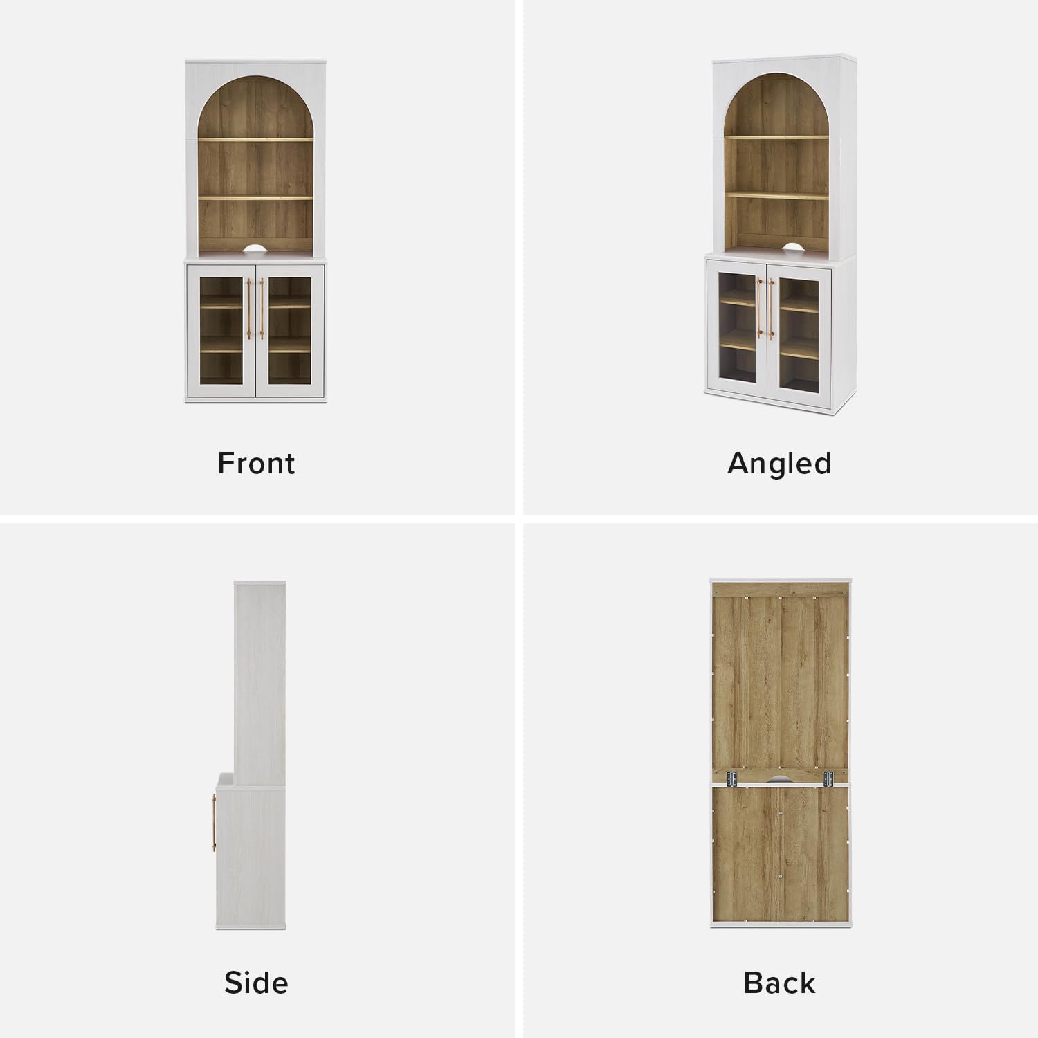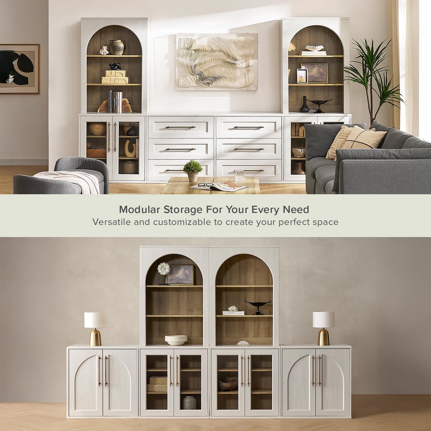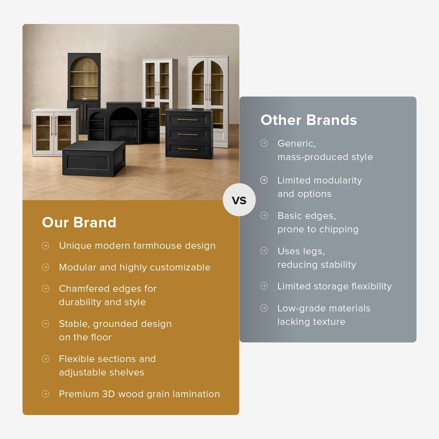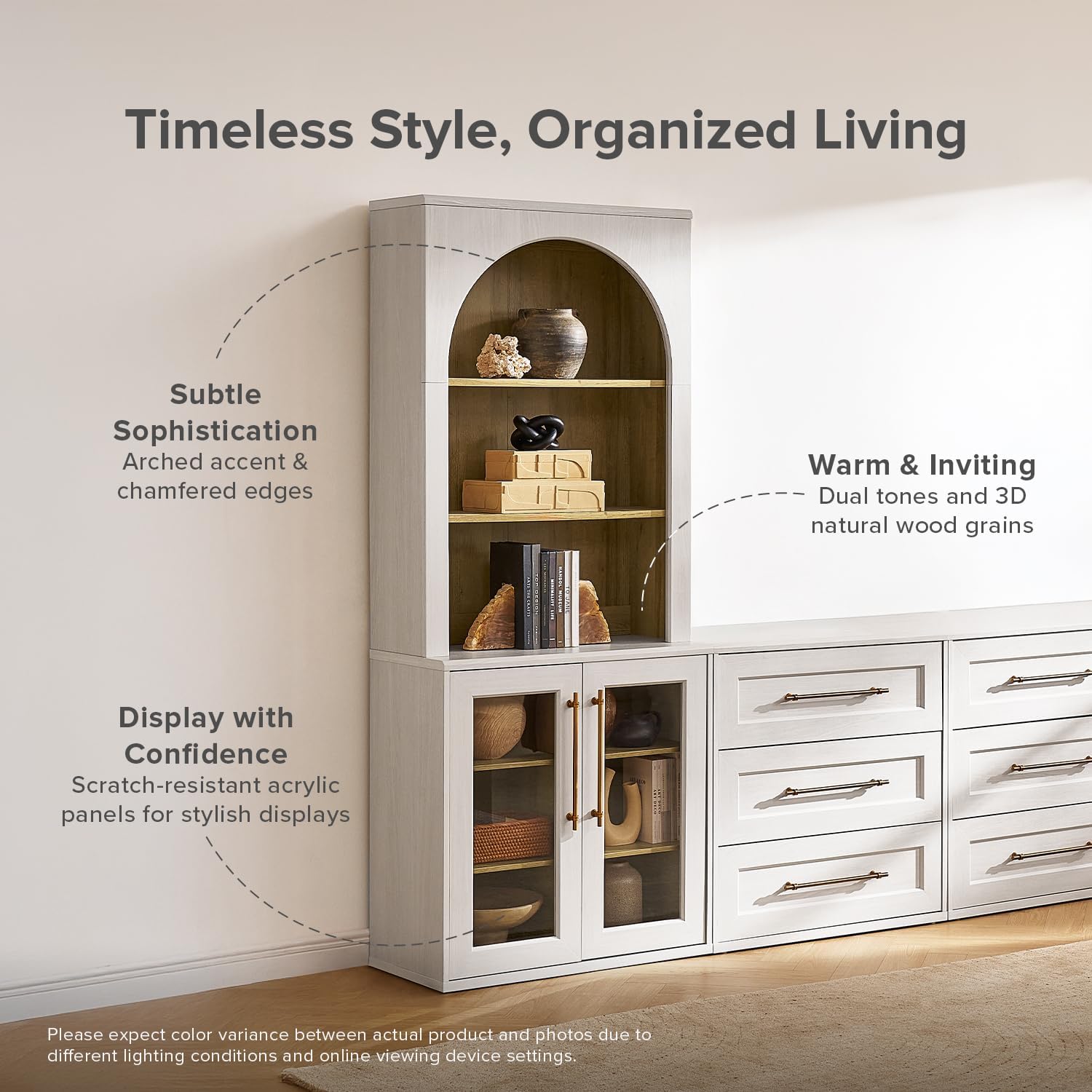 Classic Modern Farmhouse Design: Enhances the visual appeal with two-tone color contrast, trendy arch design and chamfered edges. Elevated details like accent brass handles, recessed panel frames, and clean lines, paired with natural wood grains, create a timeless and inviting space with a touch of sophistication