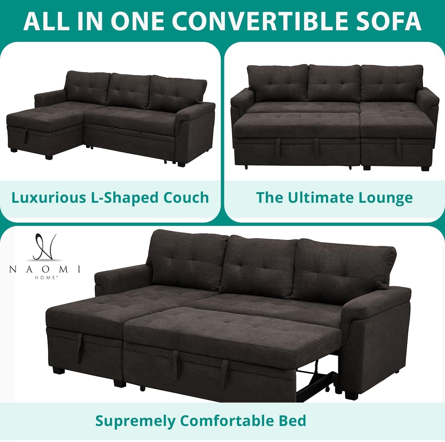 Multifunctional Sectional Sofa with Pull-Out Sleeper Bed & Hidden Storage Reversible Chaise Espresso,Velvet Space-Saving, Durable, Stylish & Easy DIY Assembly for Apartments & Small Homes
