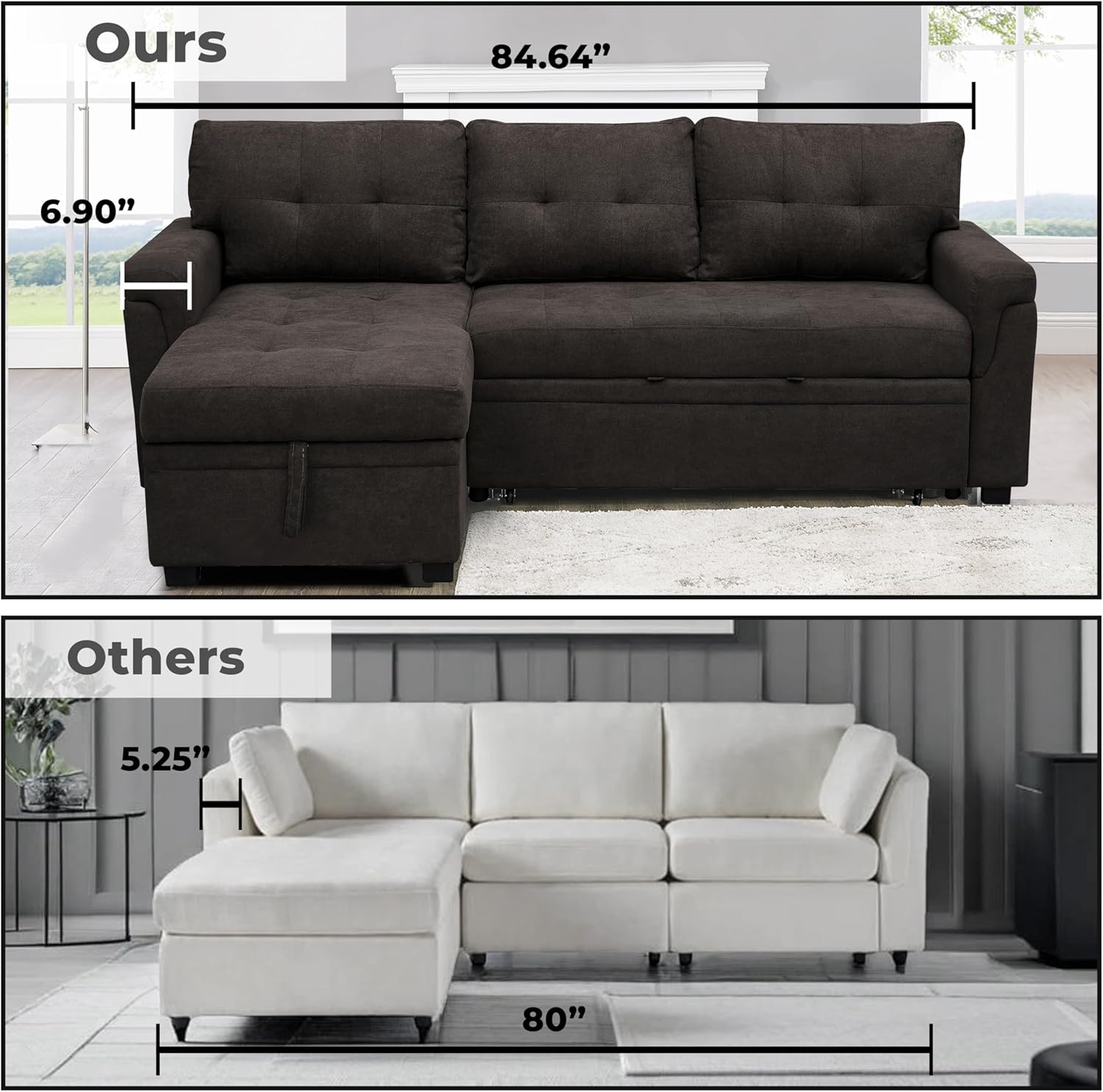 • Multifunctional Sectional Sofa with Pull-Out Sleeper Bed & Hidden Storage Reversible Chaise Espresso,Velvet Space-Saving, Durable, Stylish & Easy DIY Assembly for Apartments & Small Homes
