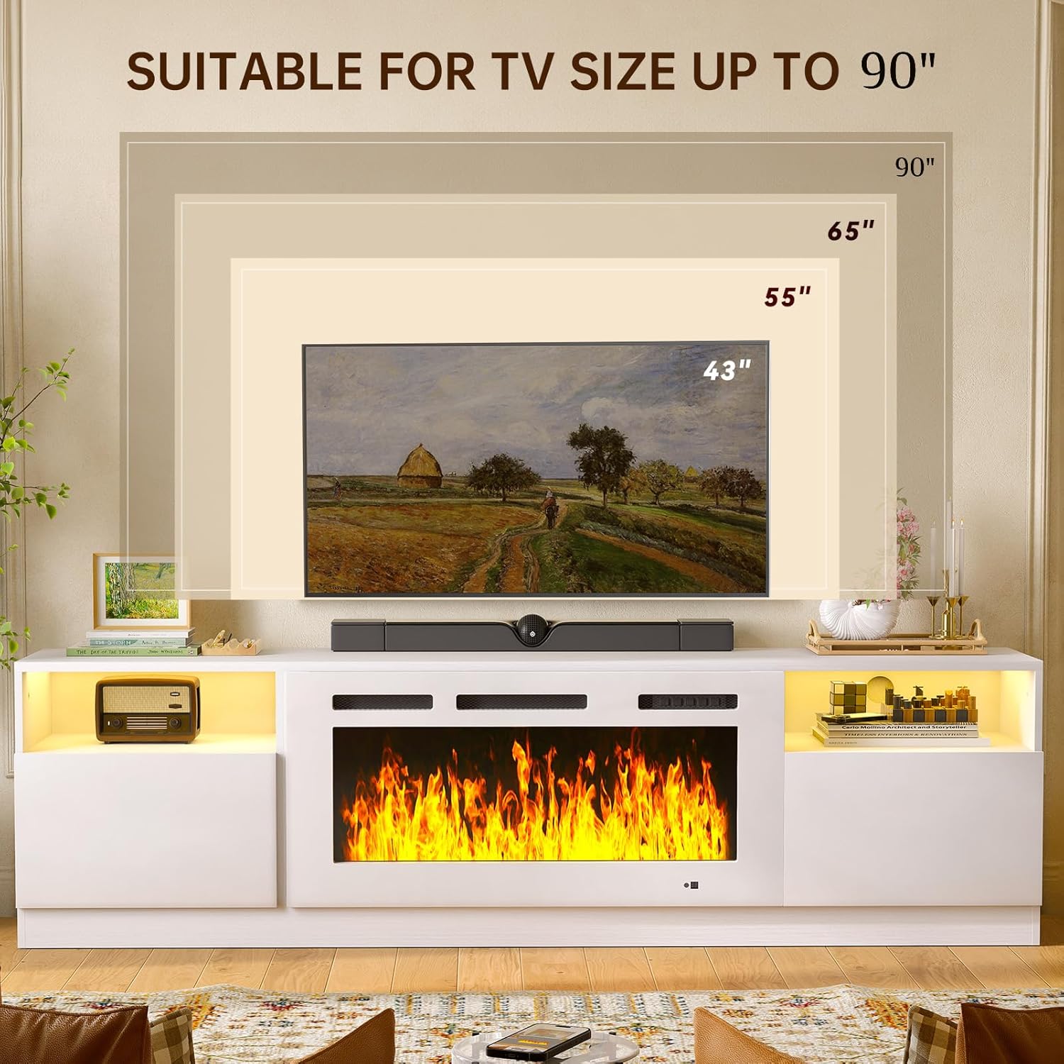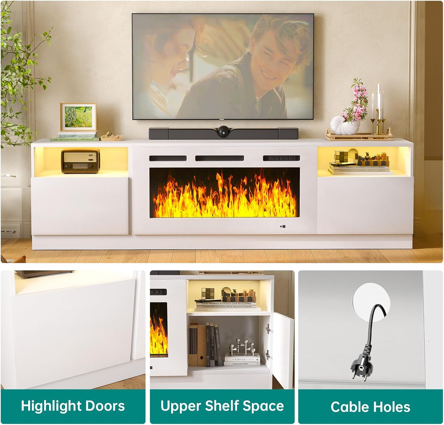 Ample Storage Space: Featuring one cabinet on each side and one additional storage compartment, this electric fireplace tv stand is perfect for keeping your space organized. It accommodates essentials like game controllers, books, and cameras, allowing for easy access. The spacious top shelf not only holds your TV but also provides room for decorative items, ensuring your entertainment area remains tidy and stylish.