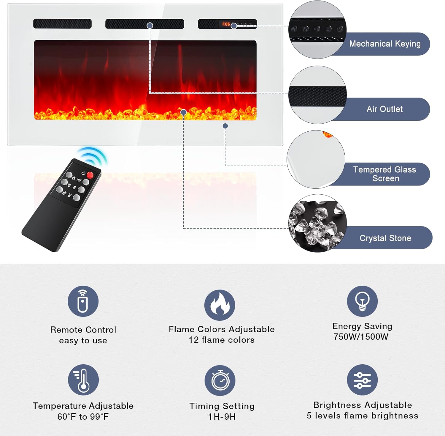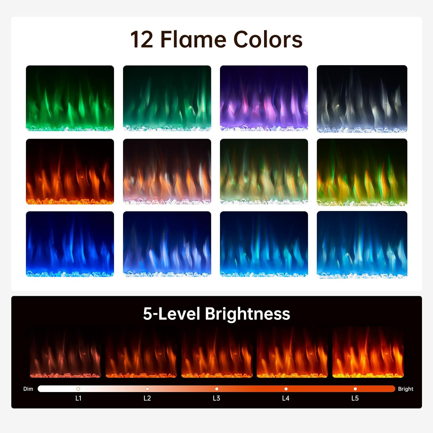 Safe and Energy-Efficient Fireplace: Heats up to 400 square feet, allowing you to set the temperature of the fireplace tv stand between 60F and 99F for optimal warmth. It features overheat protection and is CSA/ETL certified. With 12 flame options and adjustable brightness across 5 settings, you can create the perfect ambiance. A remote control is included for easy adjustments to the flames, temperature, and timer, and more.