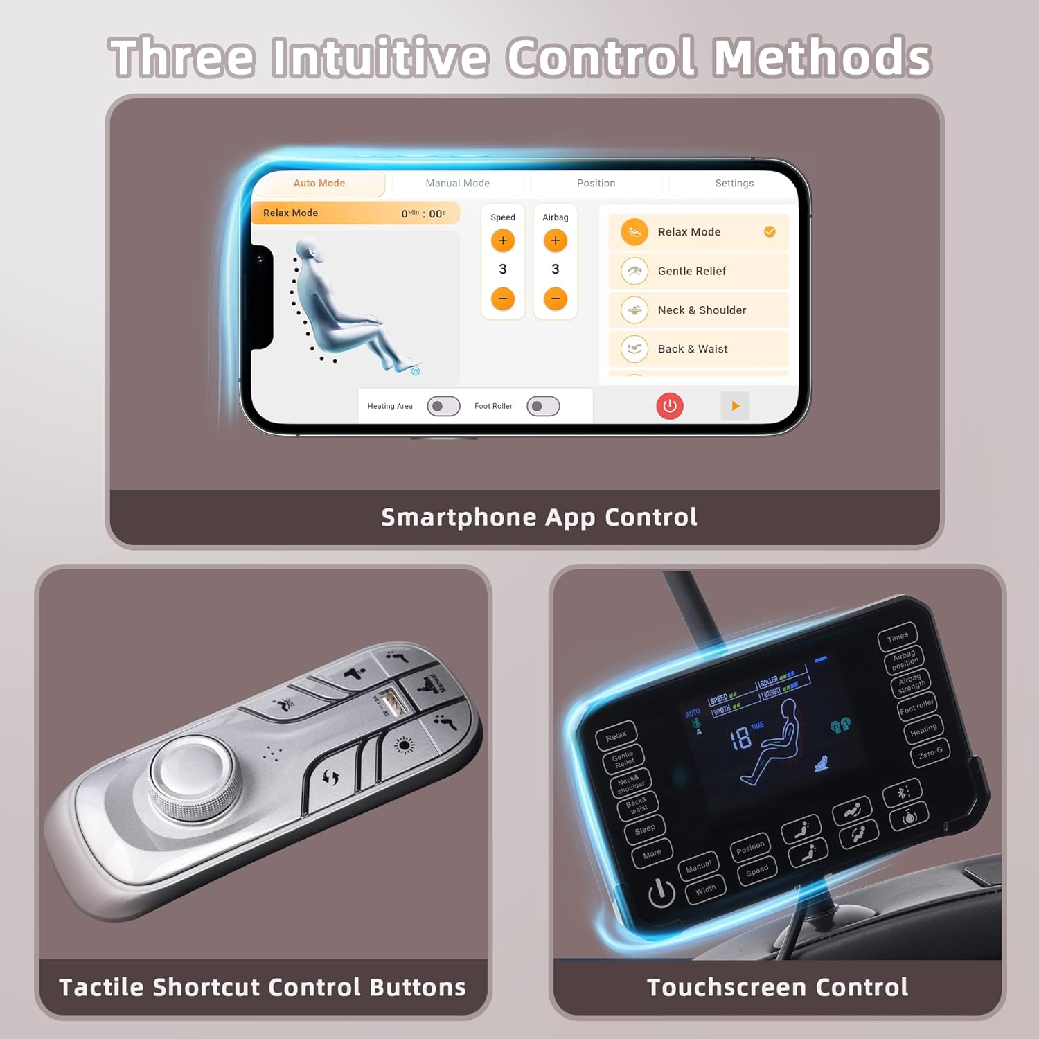12 Auto Programs & Manual Options Choose from Relax, Gentle, Neck & Shoulder, Spine Care, Full Airbag, Deep Tissue, Energy, Sleep, Office, Senior, Waist & Hip, and Vitality modes, or customize manually with multiple techniques, speeds, widths, and intensities to match your personal preferences.