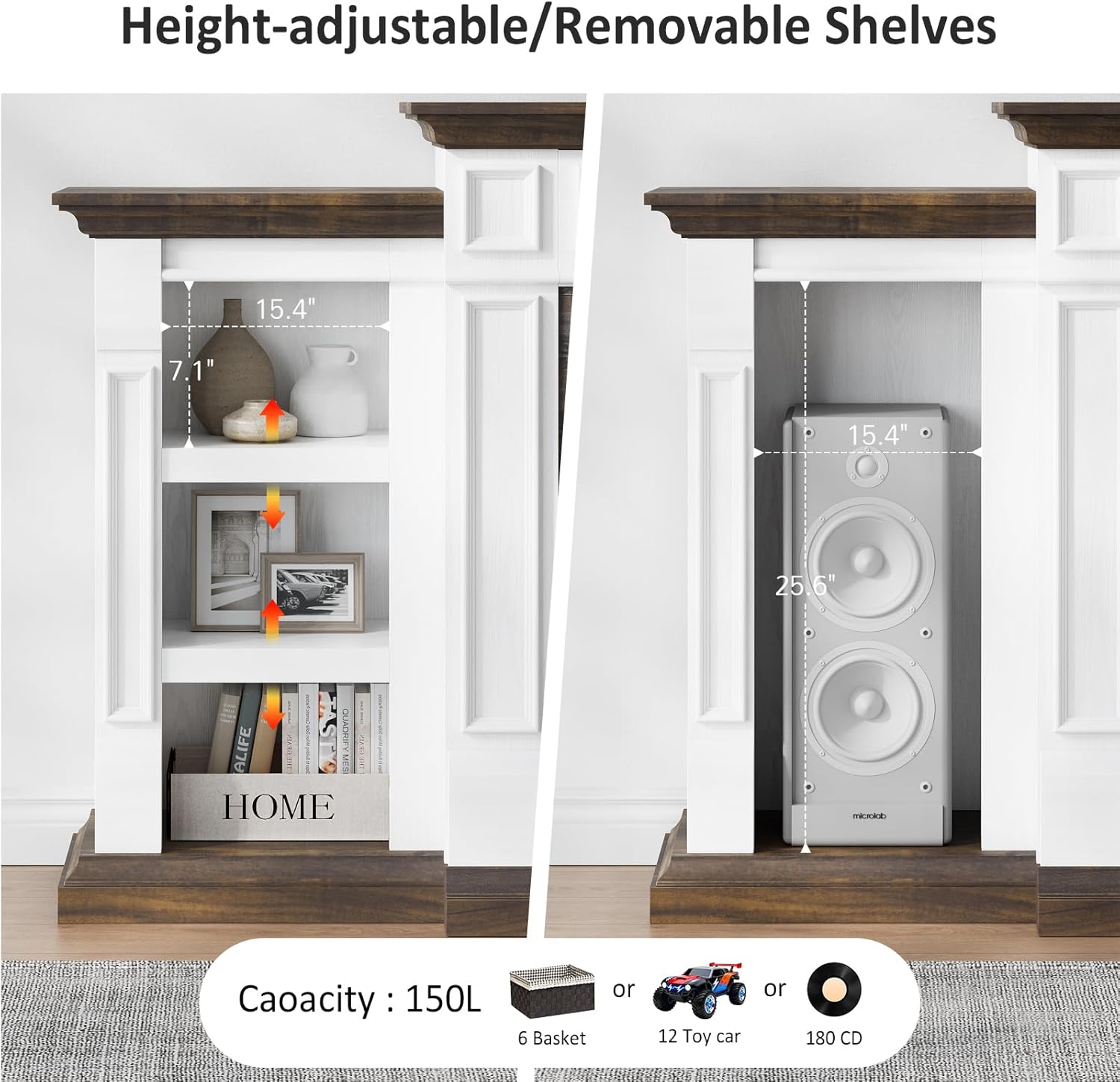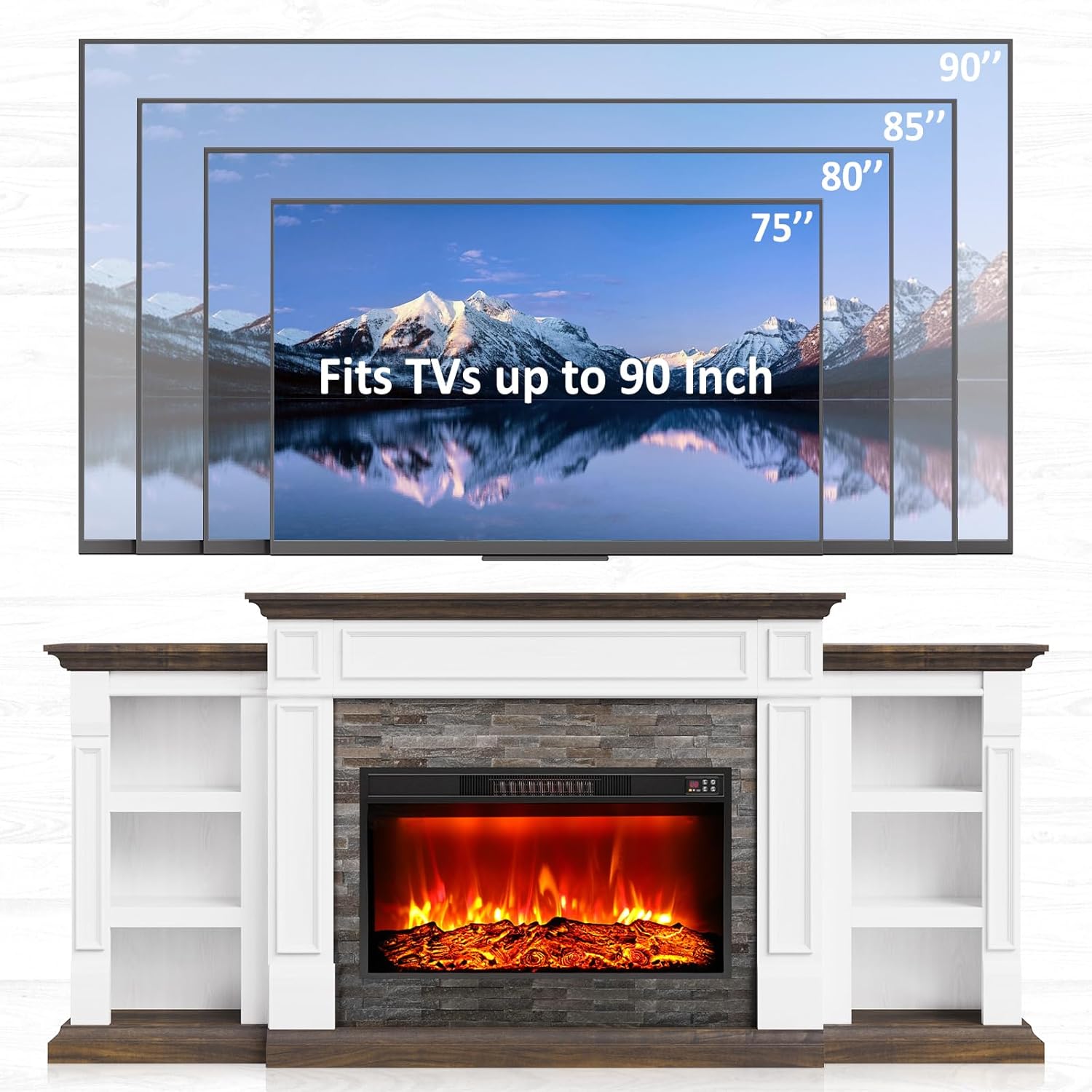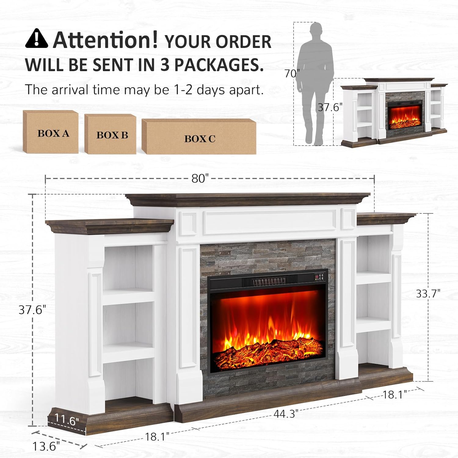 • 80" Electric Fireplace with Mantel and Cabinets, Fireplace TV Stand for Living Room Bedroom, Stacked Stone Surround and Remote Control 3D Realistic Flame, White&Brown