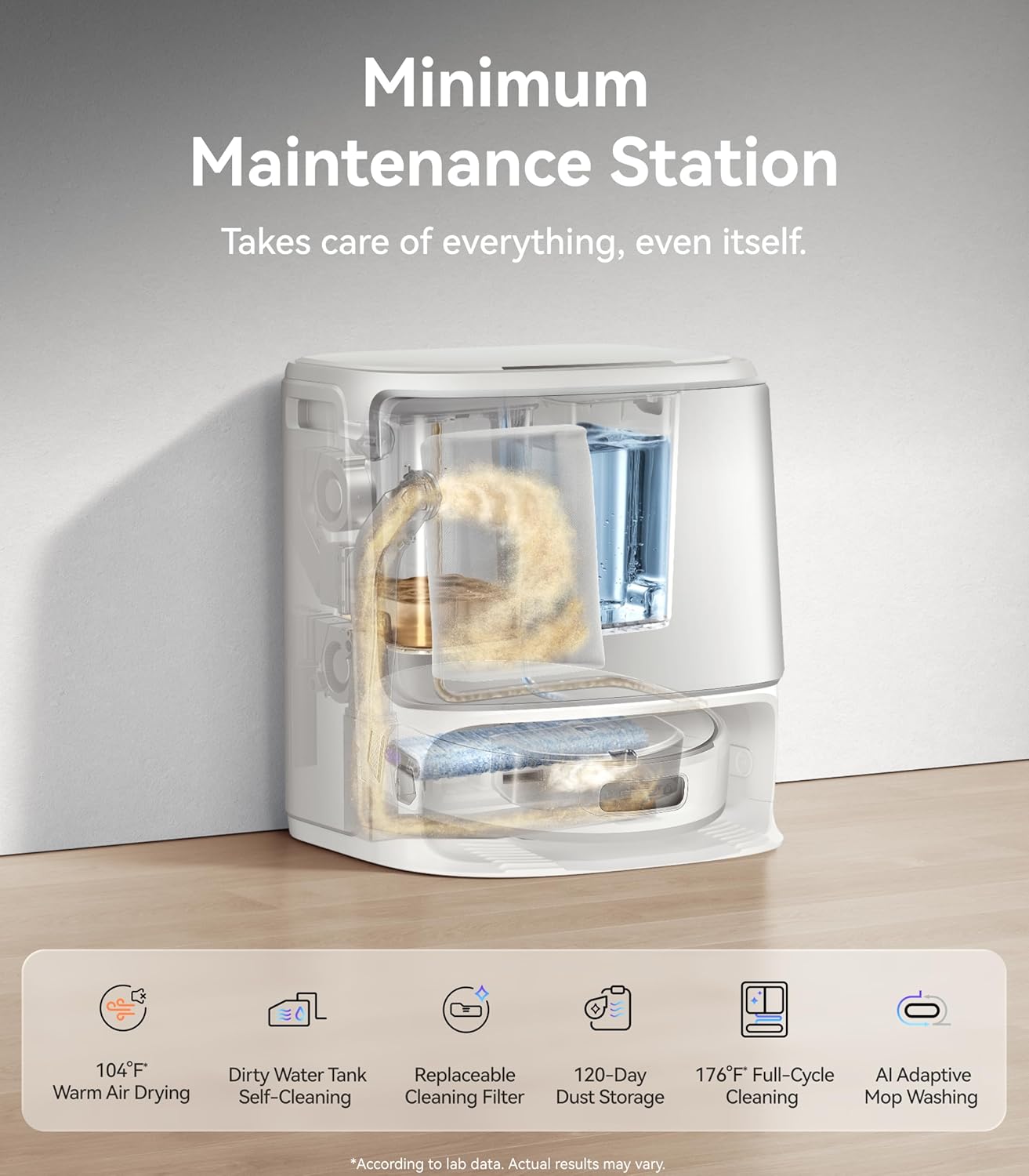AI-Adapted Base Station with Full-Cycle Cleaning: The intelligent base station washes the mops with 173F hot water and dries them with 104F warm air, keeping the pads fresh and ready for the next use. A 2.5L dust bag stores up to 4 months of debris, while a built-in stirrer prevents messesdelivering a spotless home with minimal effort.