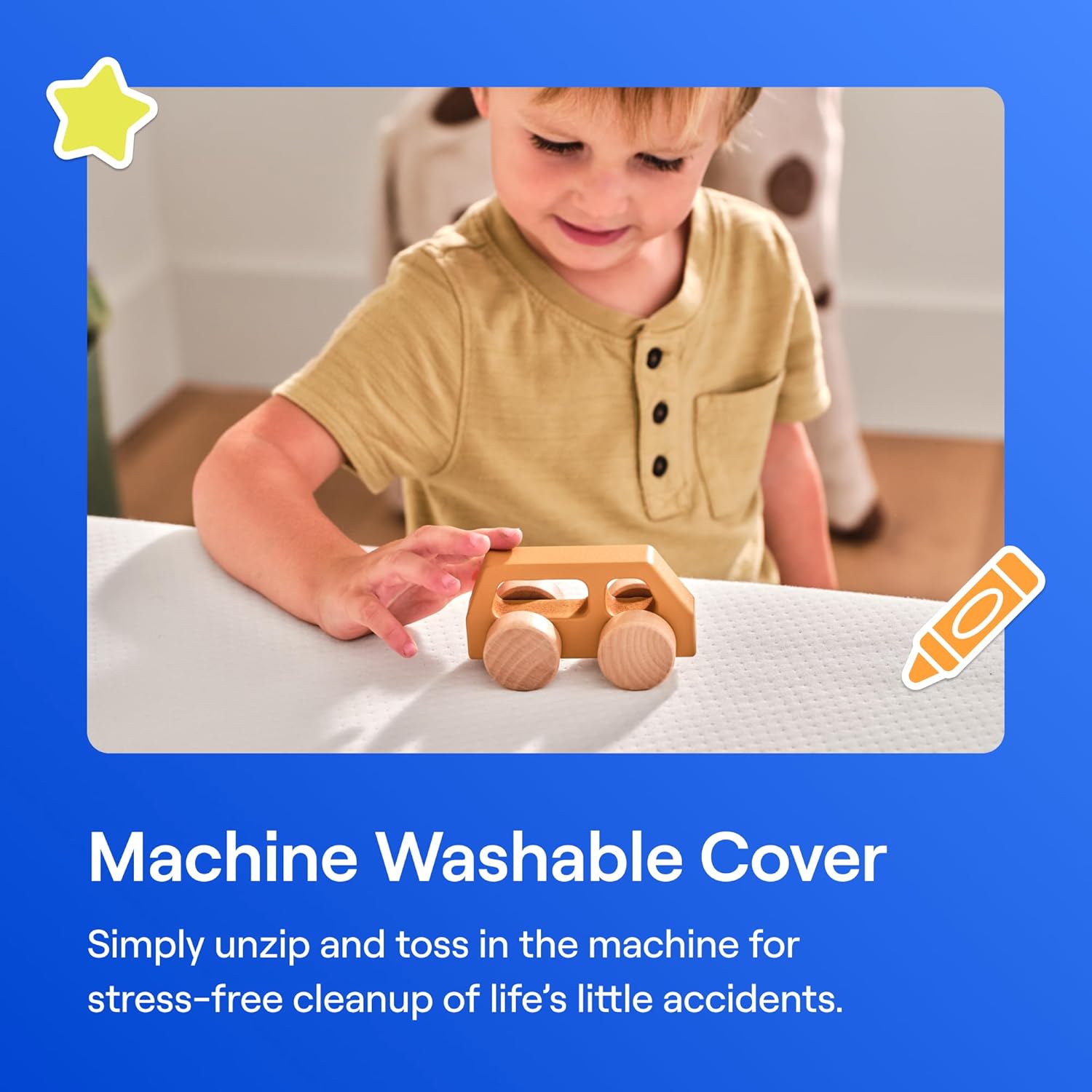 REMOVABLE & MACHINE WASHABLE COVER - Keep your childs mattress clean with its removable, machine-washable cover. Its stain-resistant and moisture-repellent design makes maintenance a breeze, offering long-lasting protection.