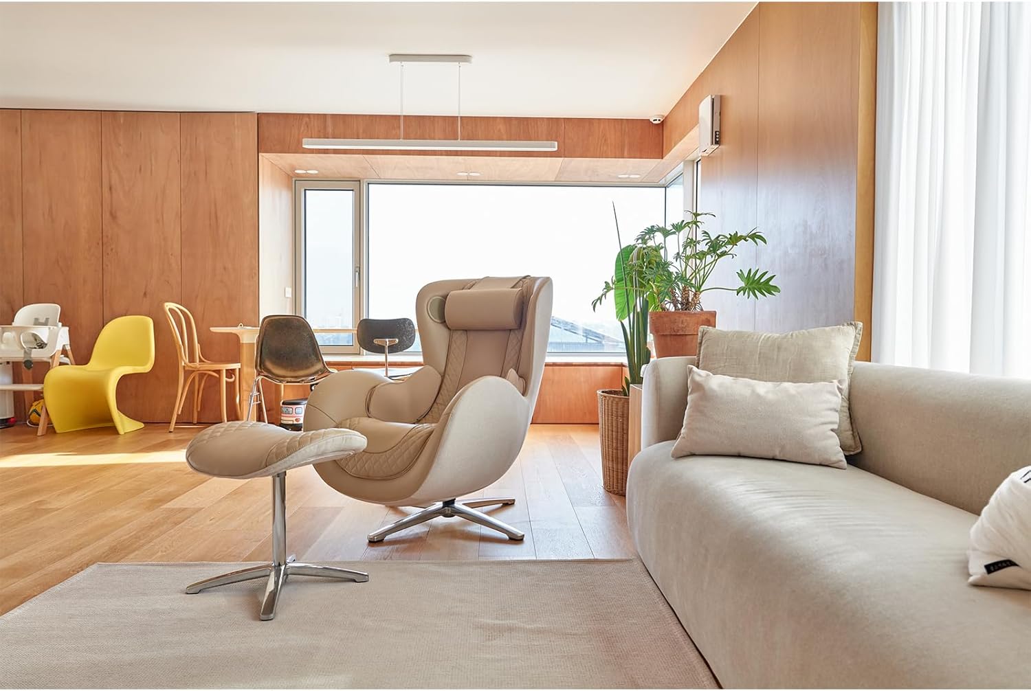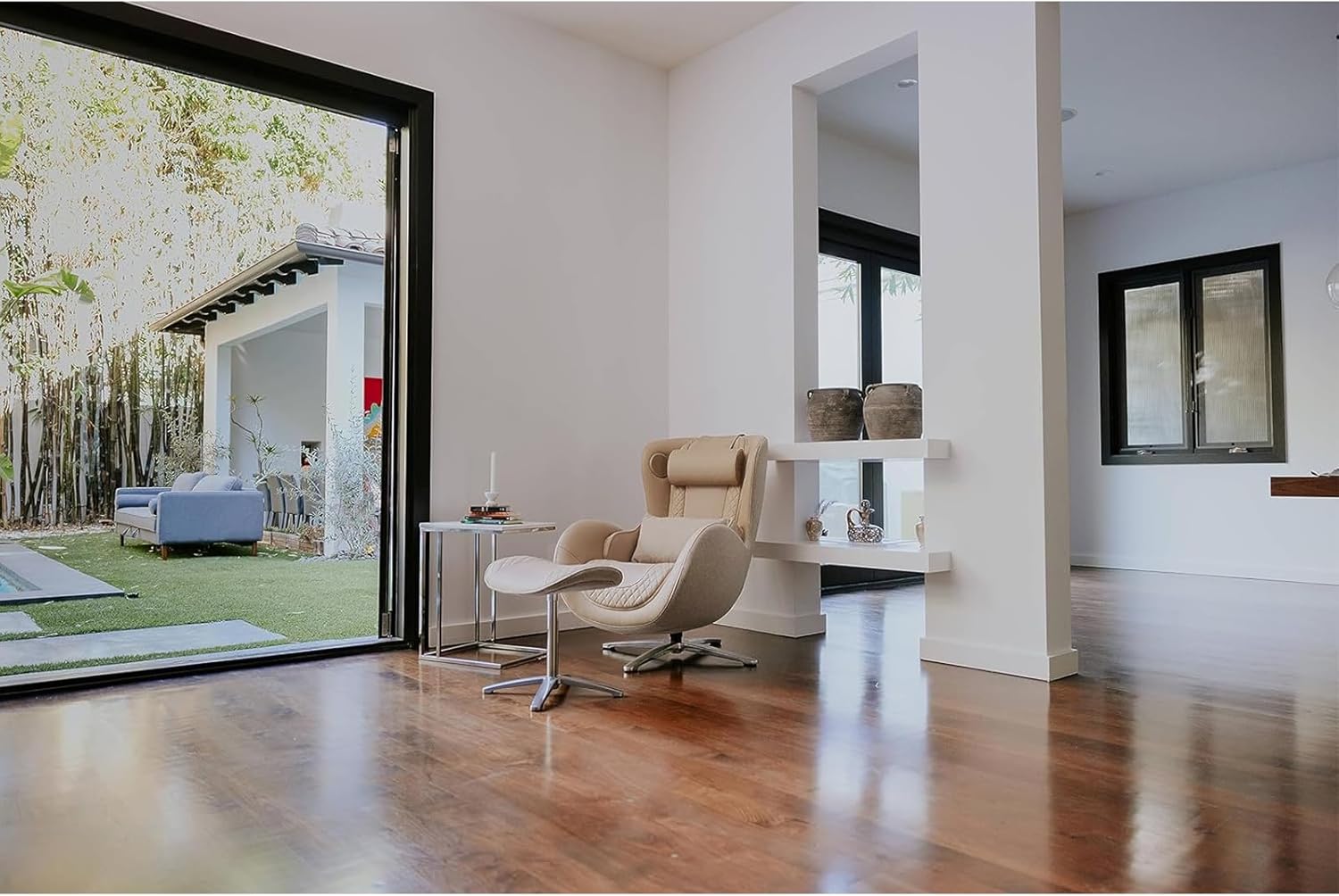 ONE SEXY LIVING ROOM CHAIR: This massaging chair performs identical to its bigger, more ugly counterparts, but with Design-Difference! This genuine leather accent chair with ottoman is uniquely egg shaped with 15 Recline, 90 Swivel and 20 high seat on a Classic Chromed 4 Point Base. It weighs only 62lbs and is a compact 26x 40. Its also one sexy a bedroom chair, tv chair and lounge chair.