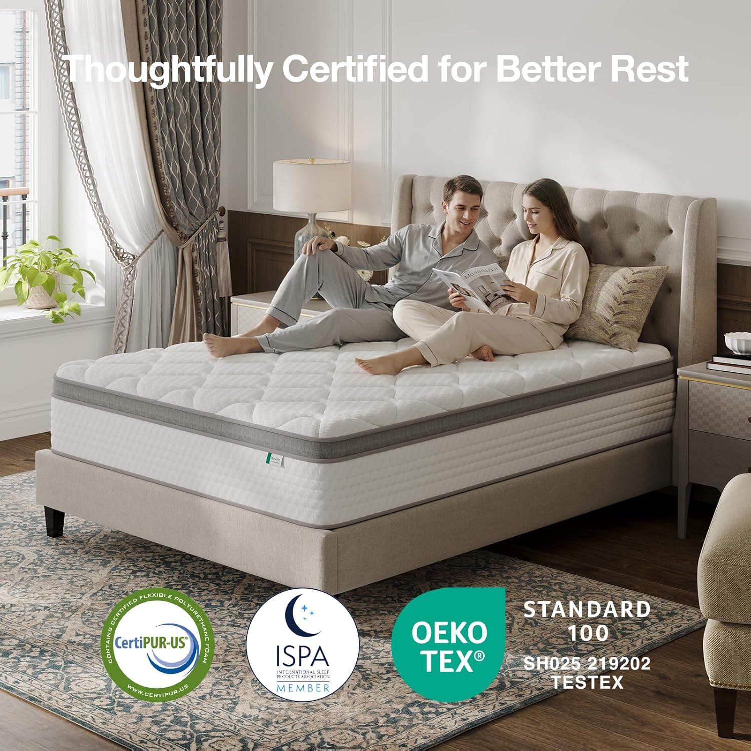 Certified Healthy and Safe: Rest easy knowing our mattress is CertiPUR-US certified and OEKO-TEX certified, it stands as a trustworthy choice for the health-conscious sleeper. Plus, it's compatible with various bed frames, allowing you to customize your sleep pace. And it comes with a 10-year warranty, ensuring a decade of worry-free, rejuvenating sleep.