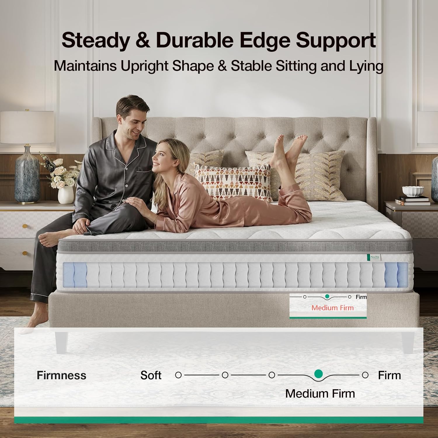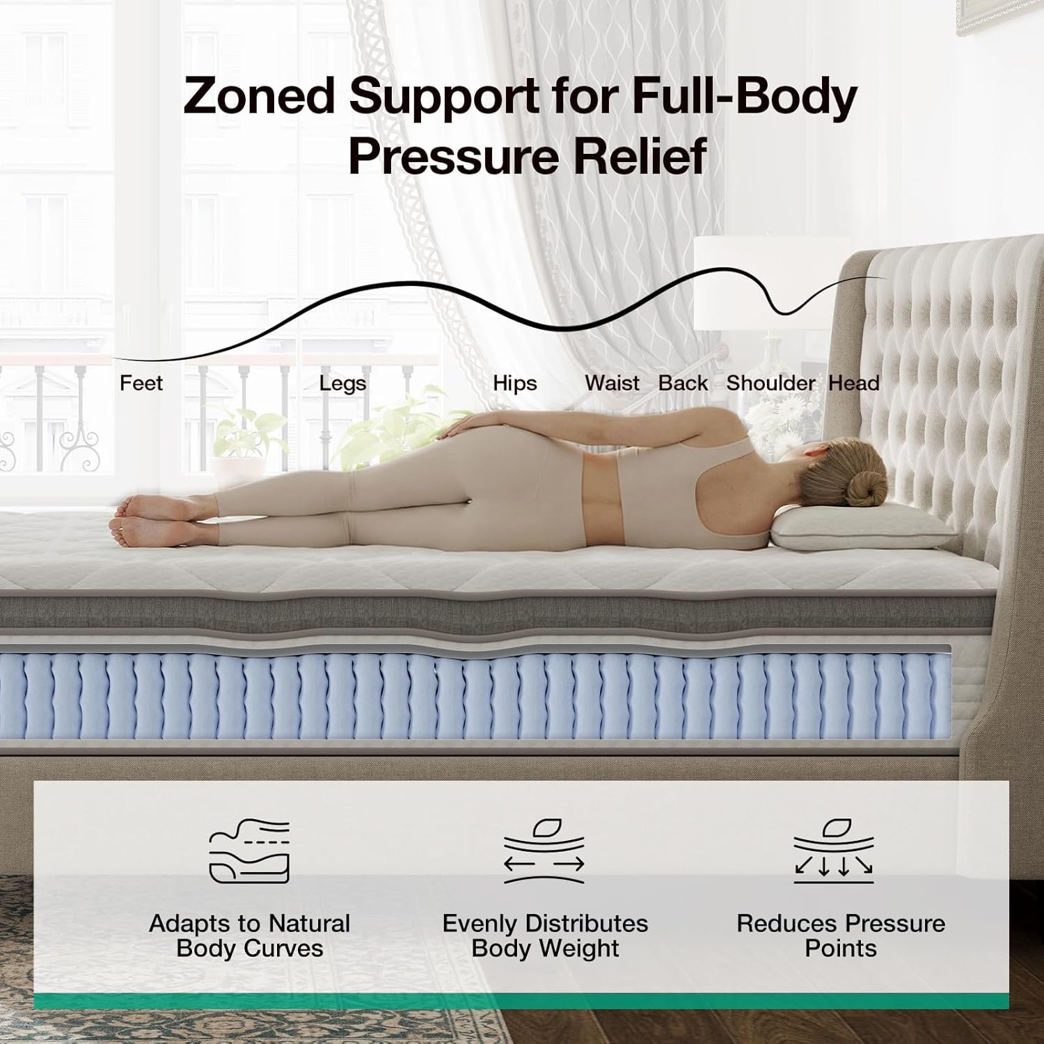 Optimal Support and Comfort: innerspring mattress utilizes independently wrapped pocket coils for targeted support. The foam comfort layer conforms to your body, relieving pressure on shoulders and hips and promoting proper spinal alignment. As a result, this king mattress in a box has a balanced and comfortable sleeping surface that optimizes overall comfort.