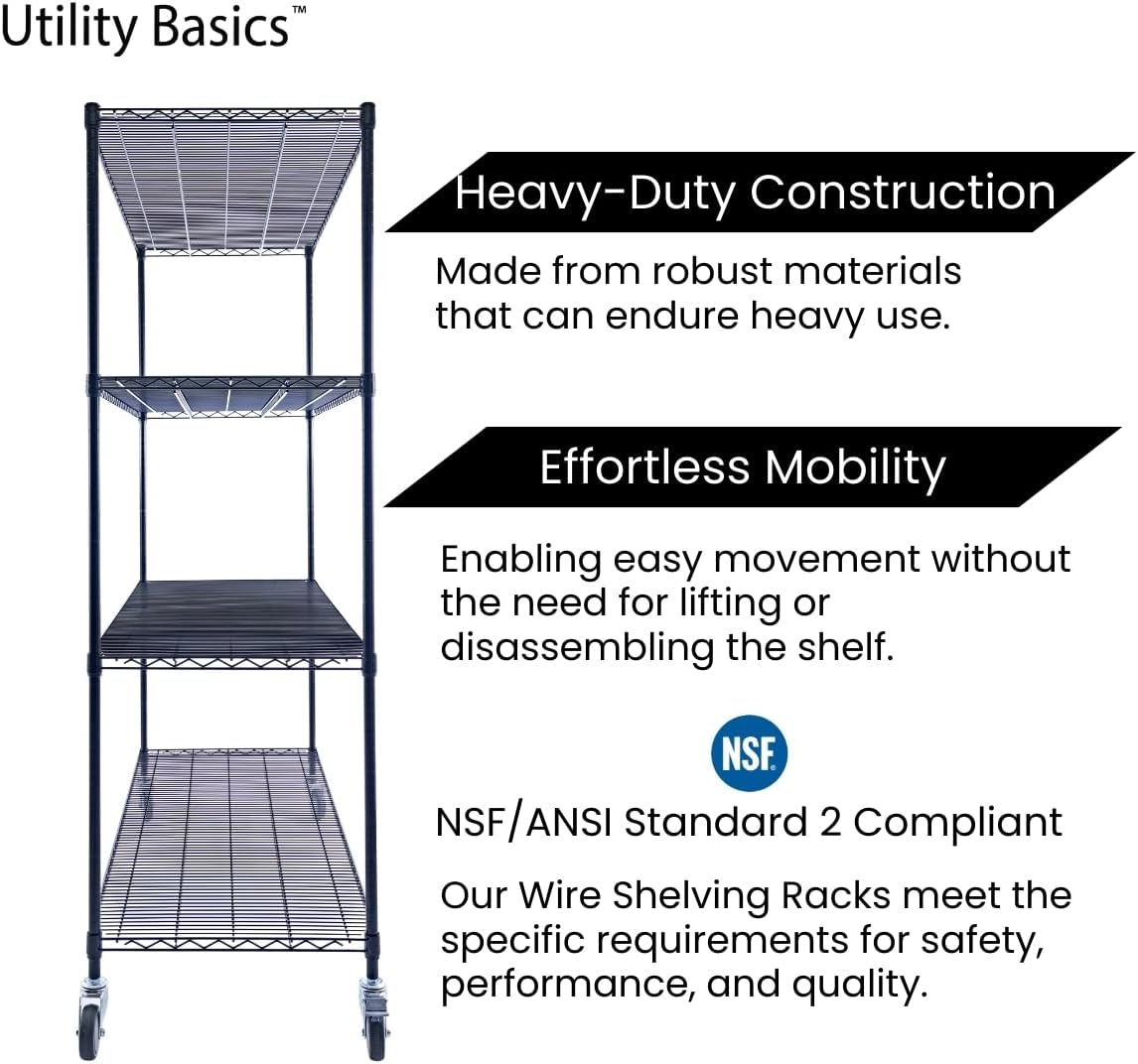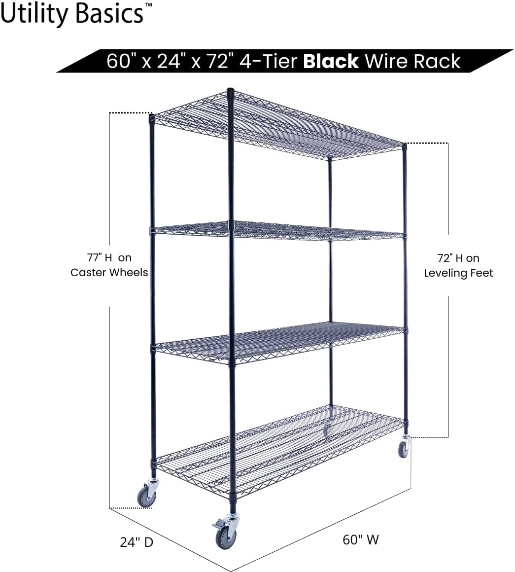 PREMIUM QUALITY AND EXTRA HEAVY DUTY Our 4-Tier metal wire shelving unit is made from high quality steel and is built to last. On Leveling Feet, the total system capacity is 3200 lbs (800 lbs per shelf). On Premium TPE Caster Wheels (included), the total system capacity is 720 lbs (180 lbs per shelf). This means you can store even your heaviest items on leveling feet without worrying about the shelving unit buckling under the weight.