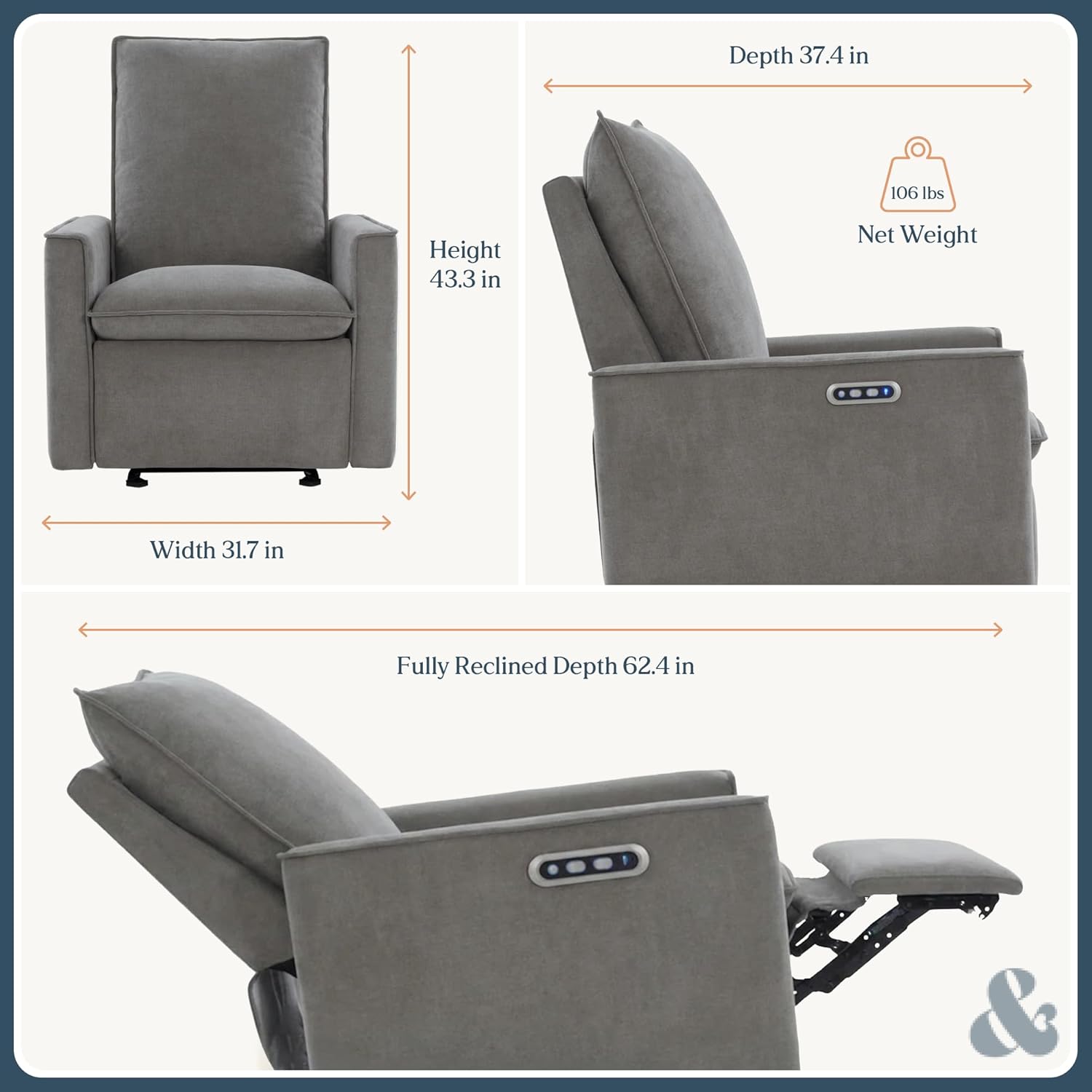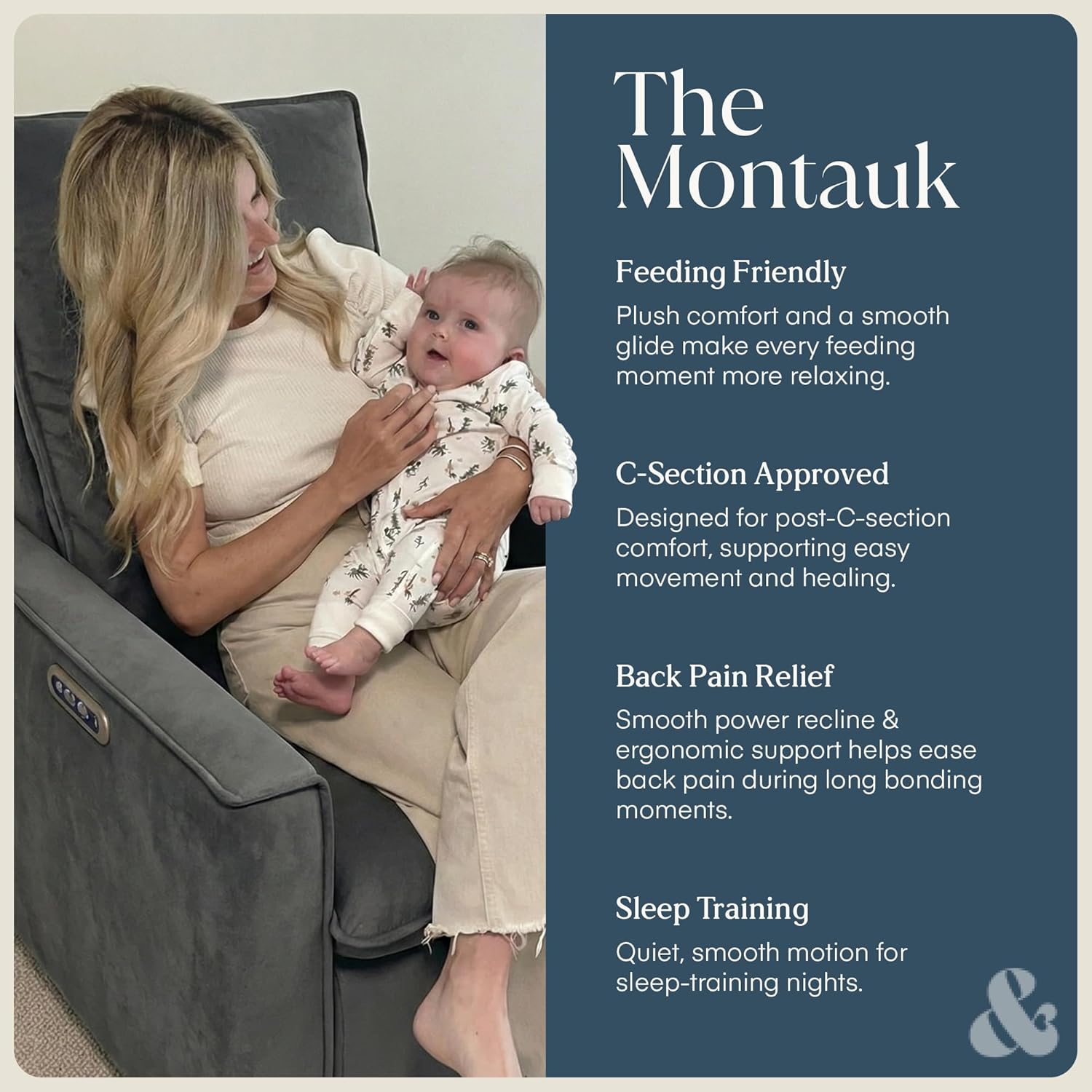 • Montauk Power Glider Recliner Premium Nursery Recliner Chair with USBA/C, Adjustable Headrest & Gentle Glide, StainResistant Upholstery, Comfortable & SpaceSmart, Gray