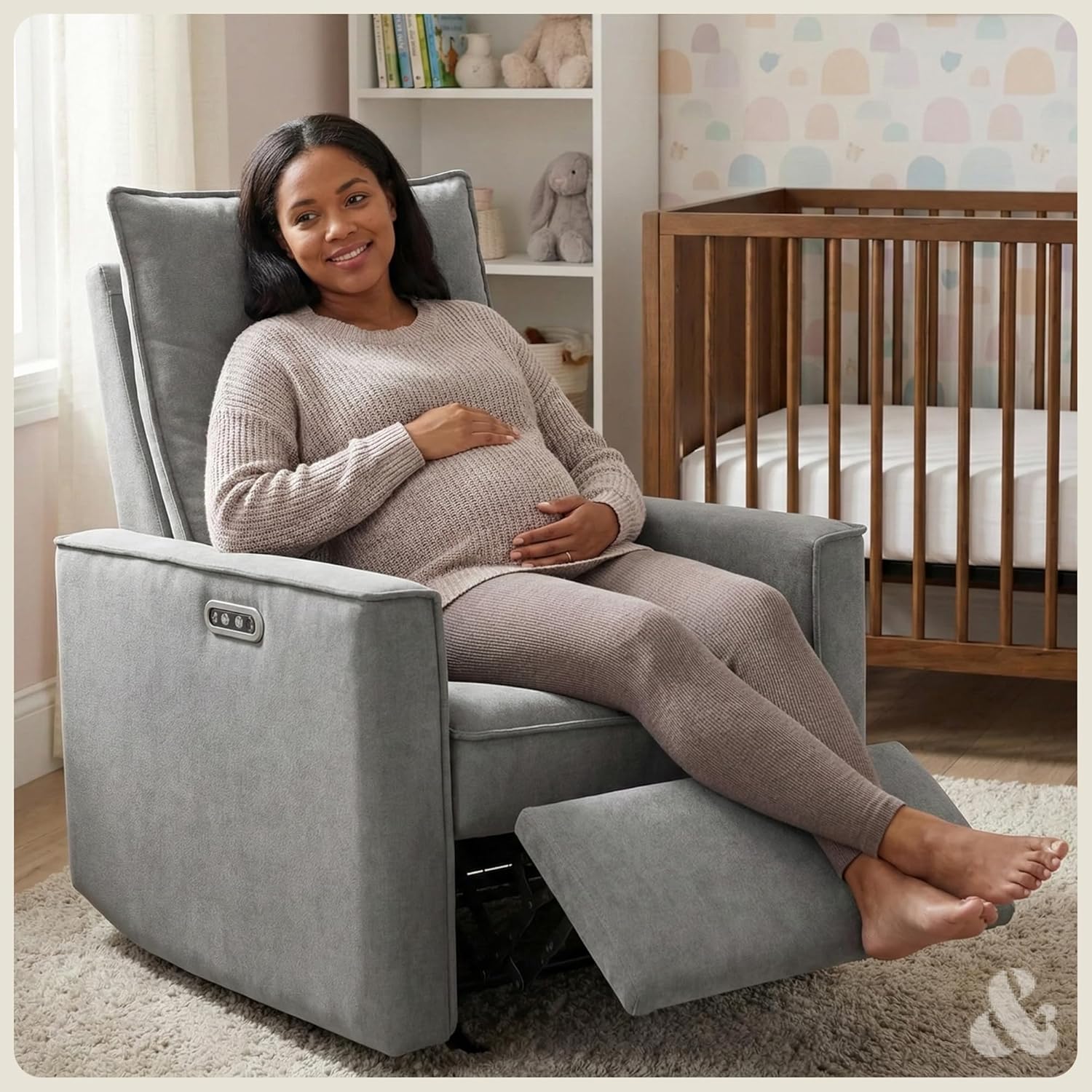 Compact footprint fits next to a crib yet sits roomy. An ideal small recliner chair for tight layouts and a versatile nursery glider that transitions to living spaces.