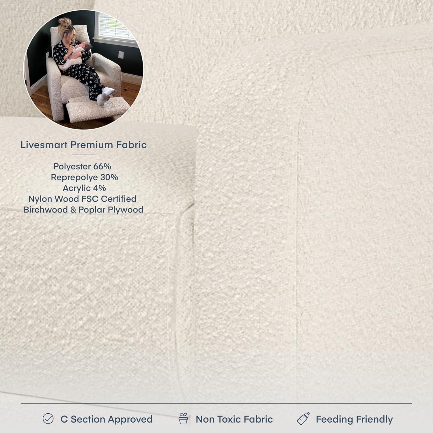 SPILL-PROOF FABRIC & SUPERIOR CONSTRUCTION: Stain resistant and liquid repellent Live-Smart materials. Built with a birchwood and poplar plywood frame and offers extra padded cushions and a warranty on all moving parts, ensuring that the Glider stands the test of time and can grow with your family.