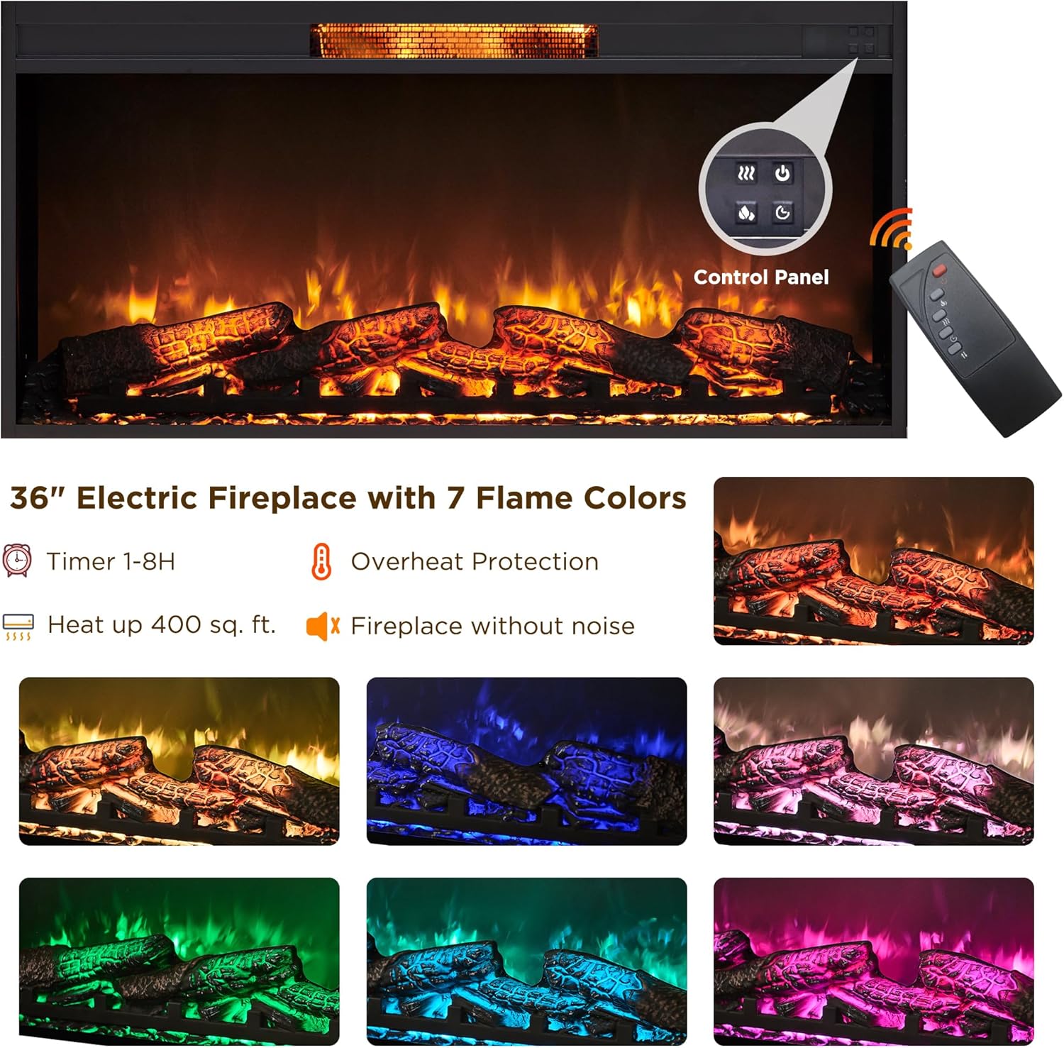 36" Electric Fireplace: Elevate your living room with this 36" electric fireplace insert, providing both warmth and ambiance. Featuring realistic 3D flame effects, glowing logs, and embers, it creates a cozy atmosphere. The powerful 5200 BTU heater efficiently warms up to 400 sq. ft., while adjustable temperature settings ensure your comfort. With a 1-8H timer and overheating protection, you can enjoy all-night coziness and safety. Plus, effortlessly control everything with the included remote