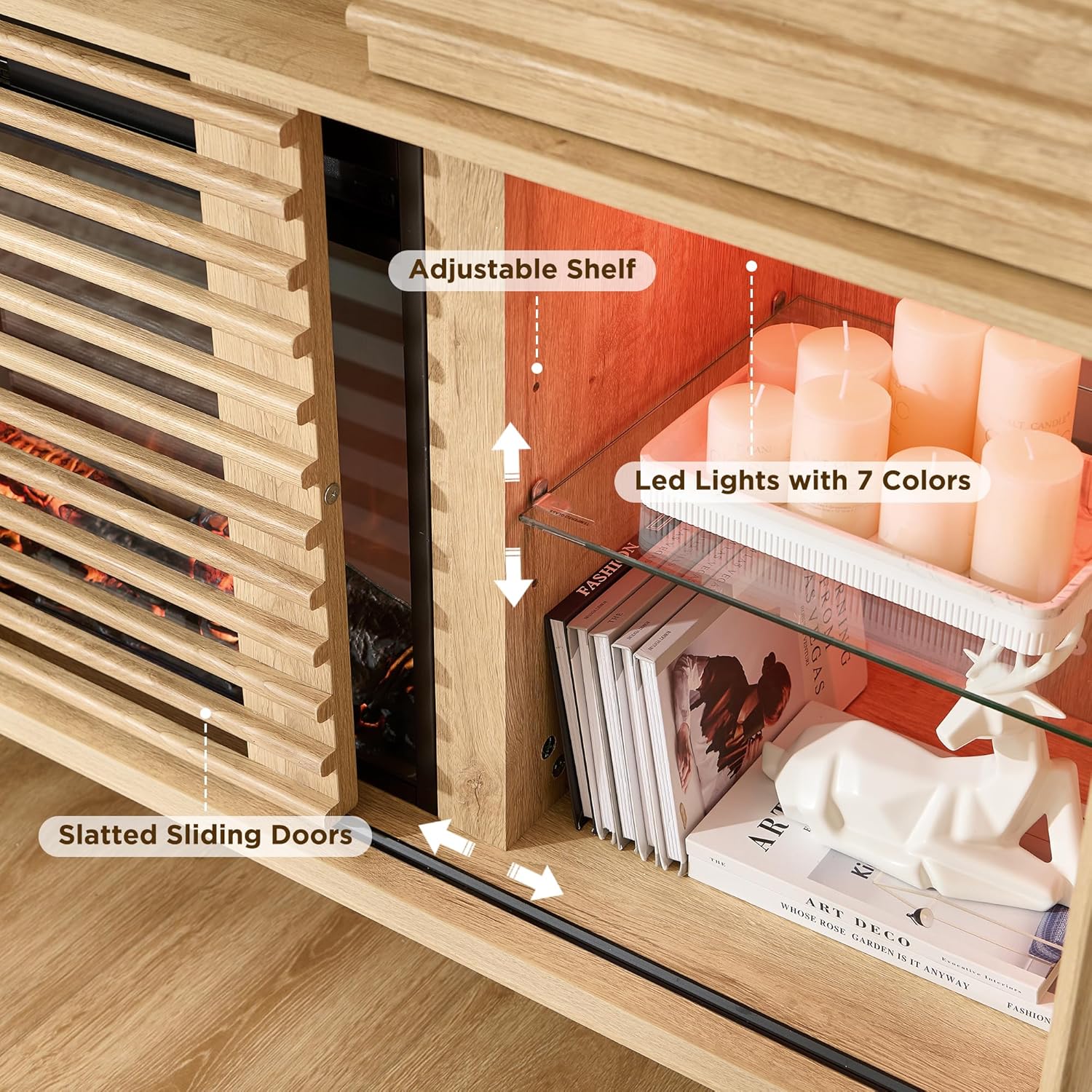 Elevate Your Space with Customizable Ambiance: Boasting 7 flame colors and 7 LED lighting options, it allows you to tailor the atmosphere to suit any occasion, from cozy movie nights to lively gatherings. Easily switch between vibrant hues and soothing tones to create the perfect mood that resonates with your emotions. This tv stand with fireplace not only adds warmth but also enhances the overall aesthetic of your home, making it a captivating centerpiece that invites relaxation and enjoyment