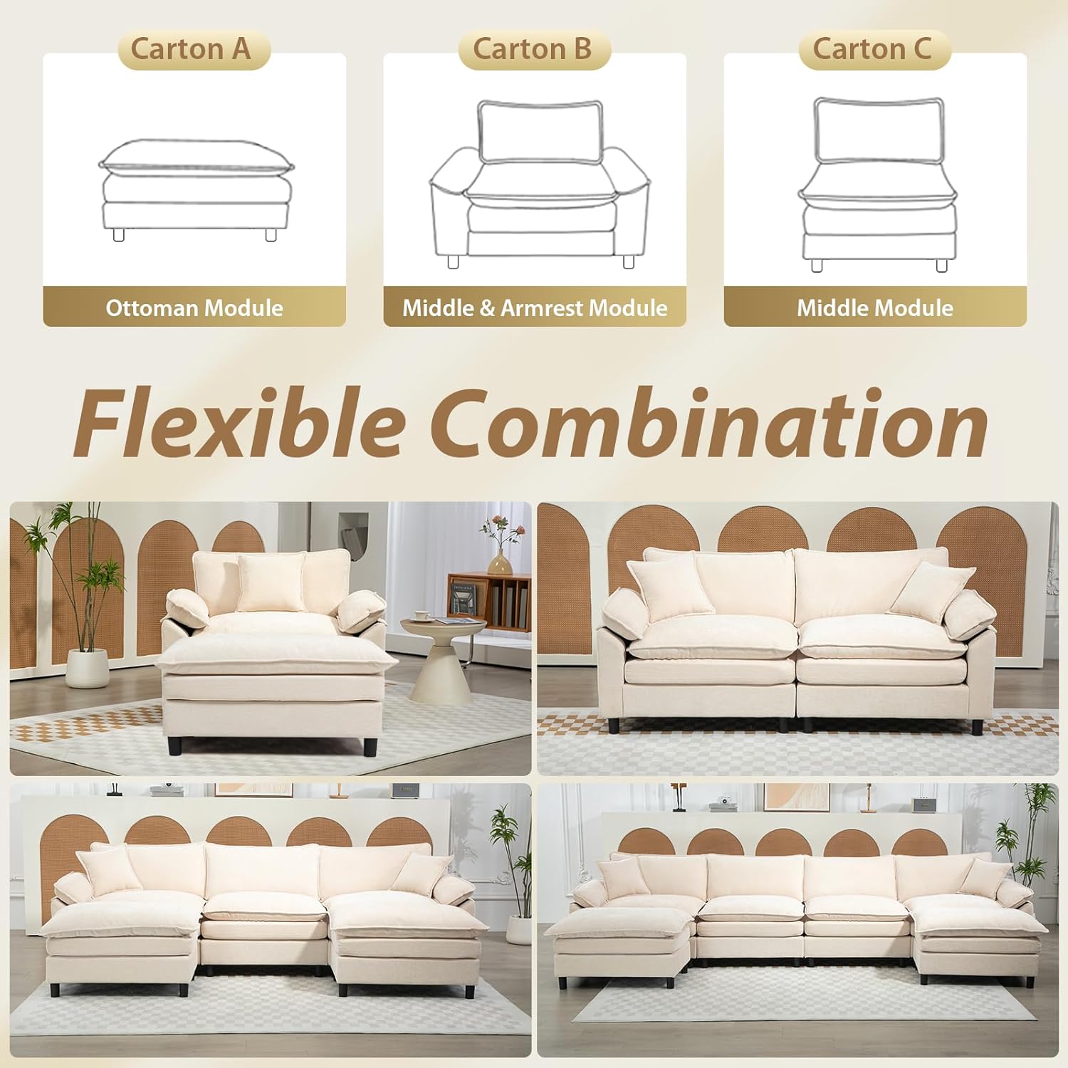 Versatile Modular Design The lounge ottoman can be moved freely and used as a footrest, extra seating, or even a small coffee table with a tray. With simple reconfiguration, you can create 2-seater, 3-seater, or even 4-seater L-shaped or U-shaped sofa arrangements to suit your personalized needs and space layout. Whether your living room is big or small, or you have guests over, this sofa adapts seamlessly, unlocking endless possibilities for your living space.