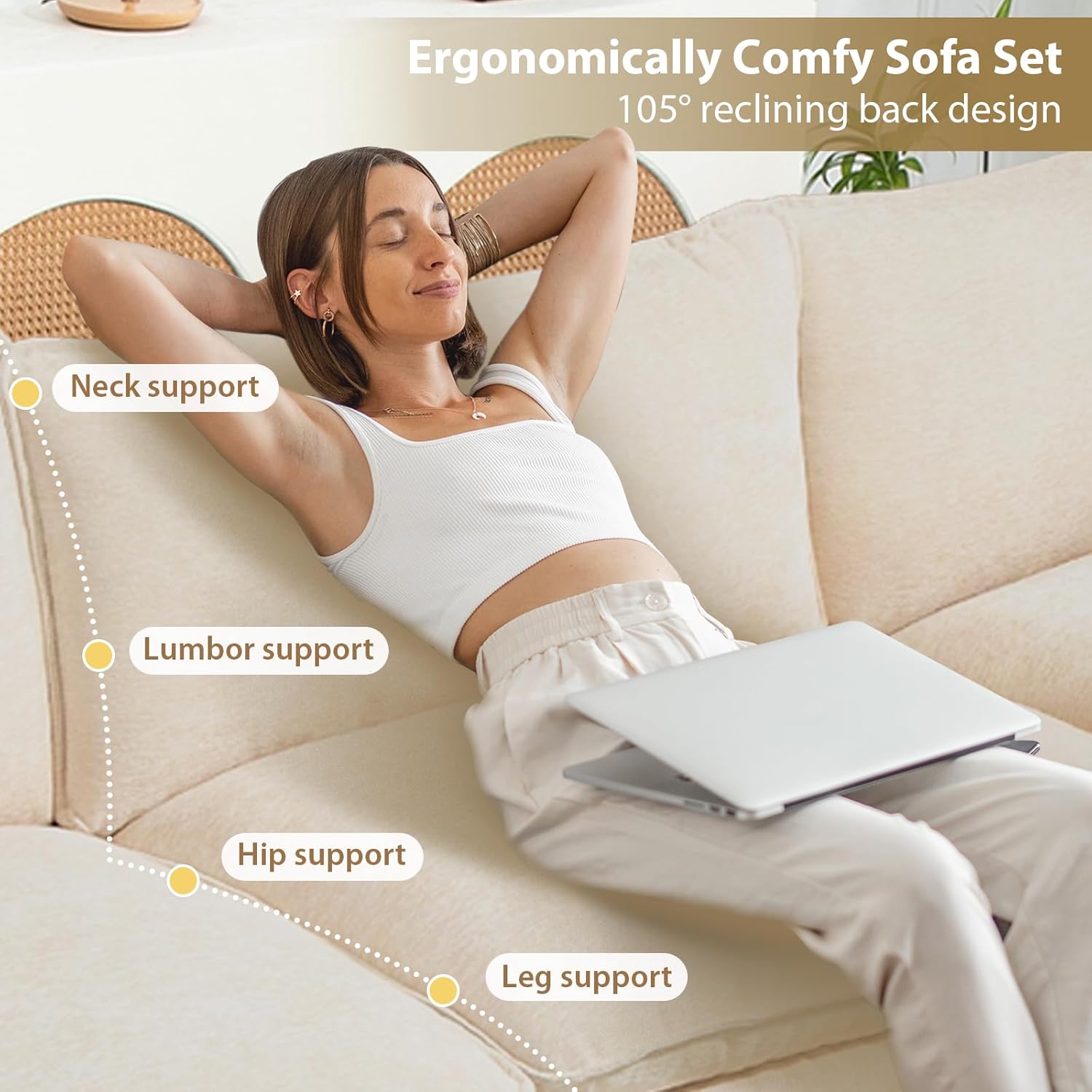 Upgraded Comfort Features This sofa combines innovative design for ultimate comfort: a. Raised sofa legs for easier standing up and convenient cleaning. b. 108 reclined backrest designed to fit the natural curve of your body, reducing fatigue from prolonged sitting. c. Lumbar pillows included for extra support and protection of your lower back. d. Removable zippered armrests that double as headrests, ensuring unparalleled comfort during relaxation.