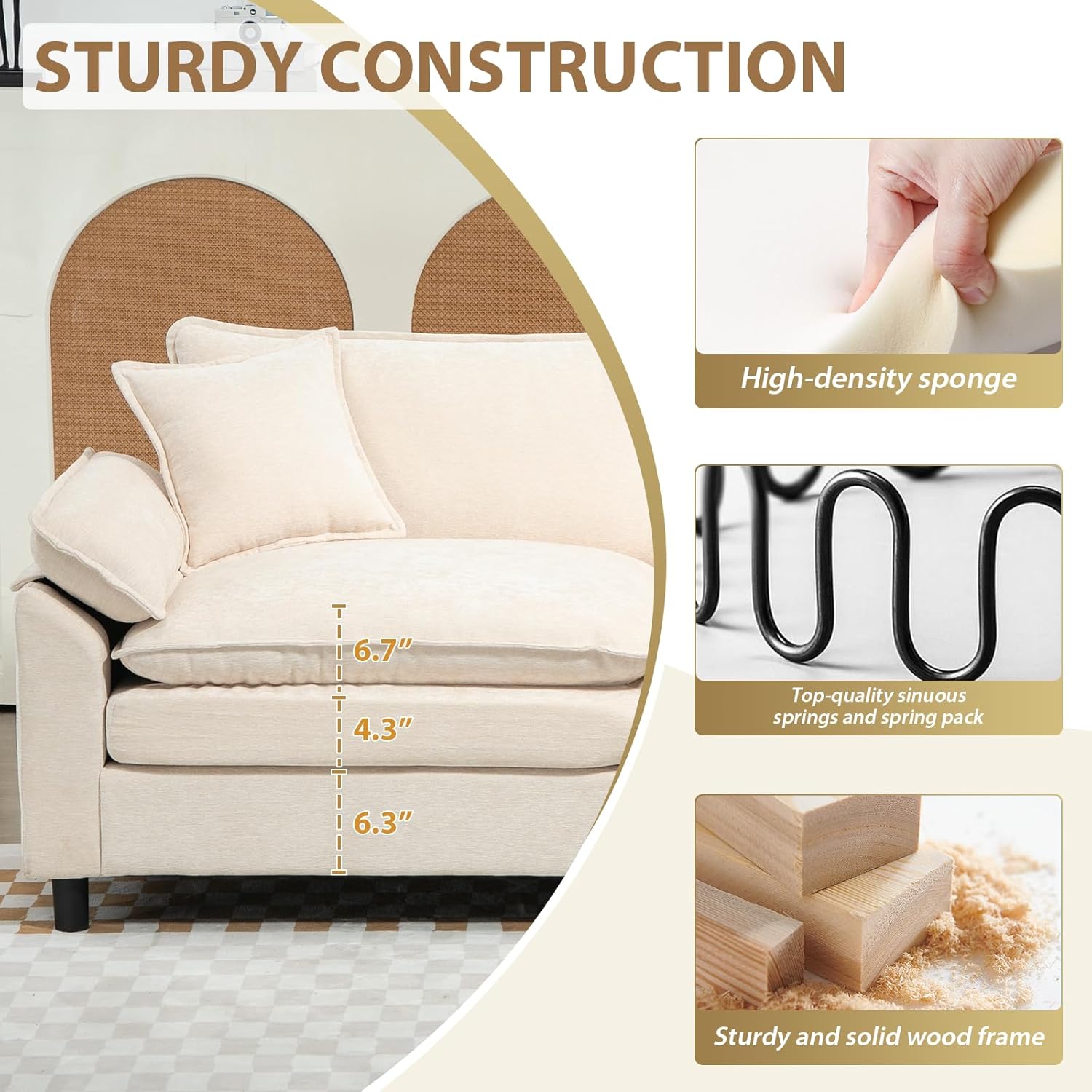 Thoughtful Service & Reminders The Large living room couch is shipped in three separate packages, which may arrive at different times. The vacuum-sealed cushions will need 24 hours to fully expand after unpacking. Detailed assembly instructions and tools are included for hassle-free setup. If you have any questions, our dedicated customer service team is available 24/7 to ensure a worry-free shopping experience.
