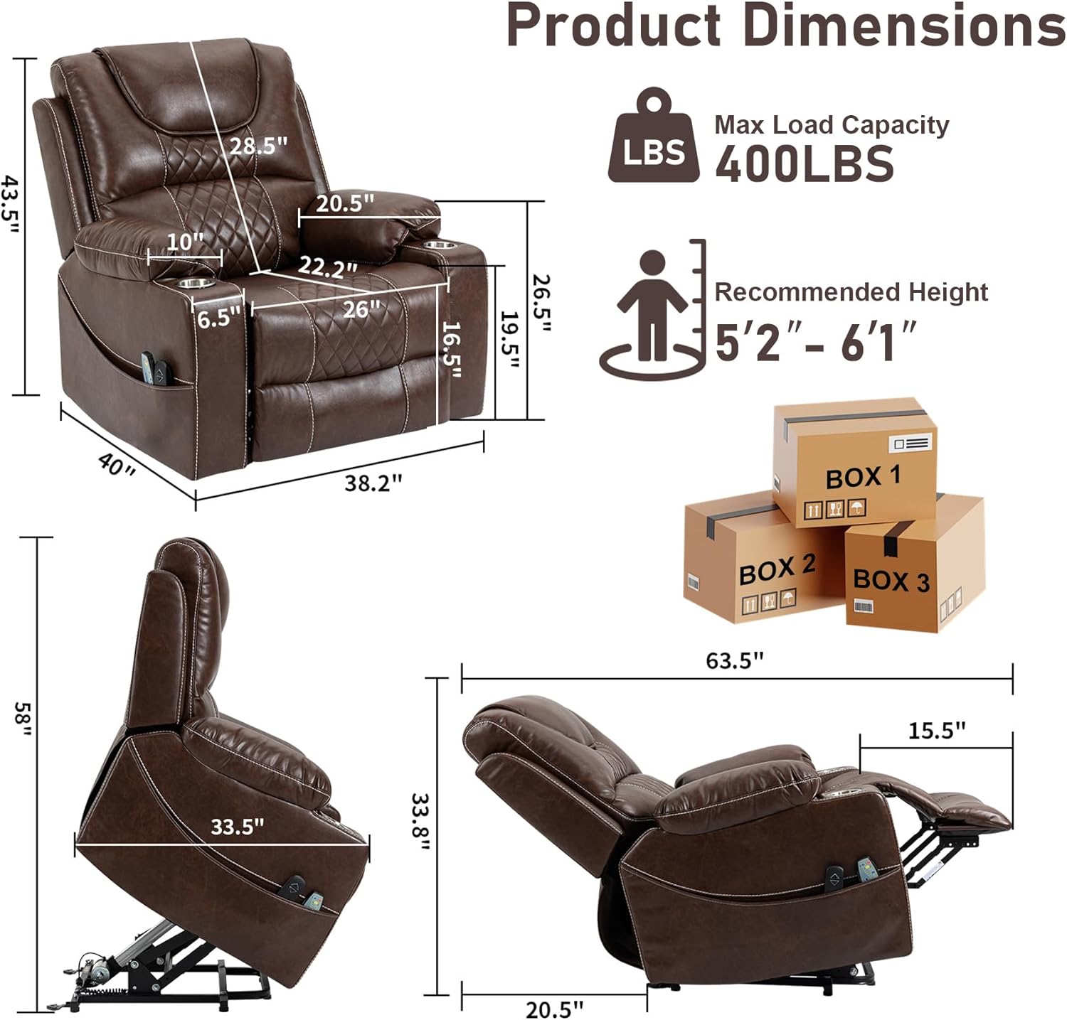 Extra Wide Seat: 26'' seat width will provide ample room and support for big people or those who need extra space, allowing the user to adjust the posture more freely without any feelings of constraint. The length of the lift chair lying flat is 63.5 inches.Overall size: 40"L x 38.2"W x 43.5"H, footrest length: 15.5" (Recommended Height: 5'2"-6'1")