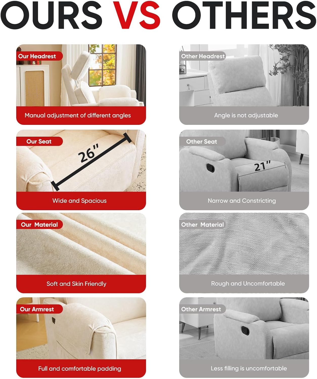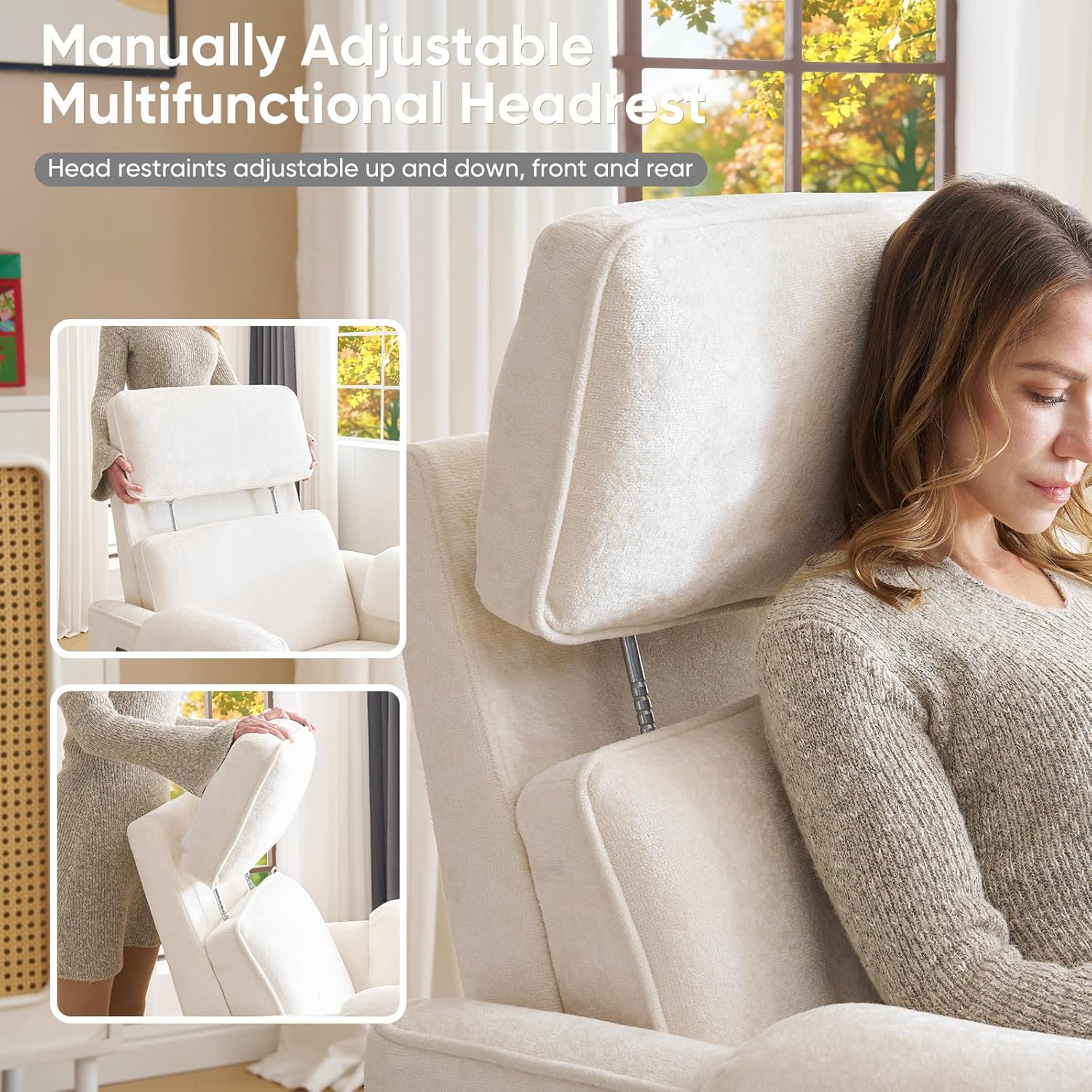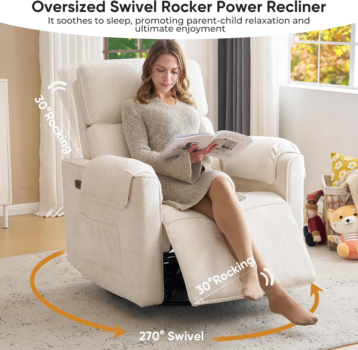 26" Extra Wide Seat: The 26" wider and larger seat is not only spacious and comfortable, but also suitable for a wide range of people, especially mothers and babies, as well as tall adults who can play and rest with their babies on the nursery recliner. The skin-friendly and comfortable chenille fabric and the stylish and beautiful design add a touch of sophistication to living rooms, bedrooms and nurseries.