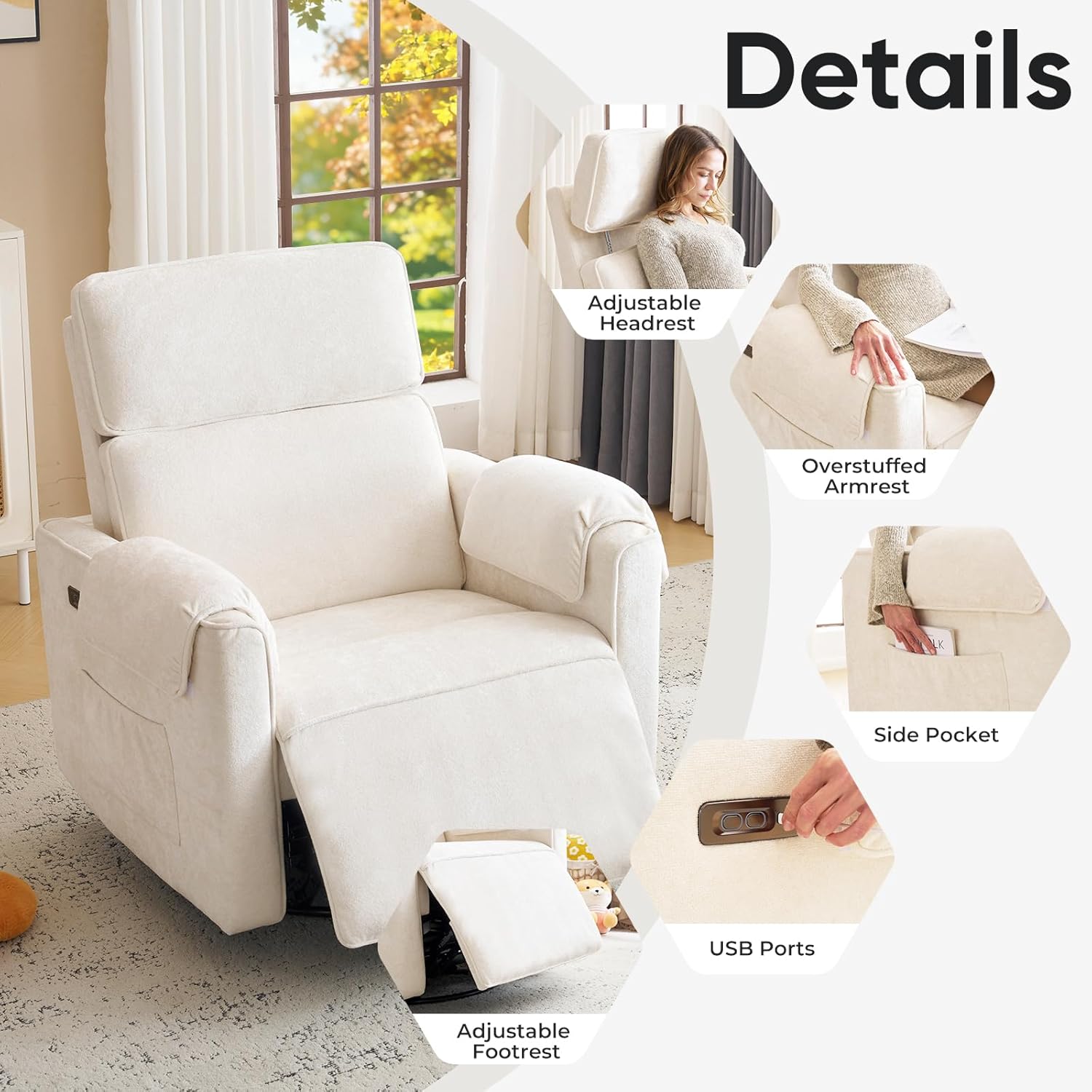 • Oversized Power Recliner Chair, 26" Extra Wide Swivel Rocker Recliner with Adjustable Headrest, Chenille Glider Rocking Nursery Chair with Overstuffed Armrest, USB Ports, Cream