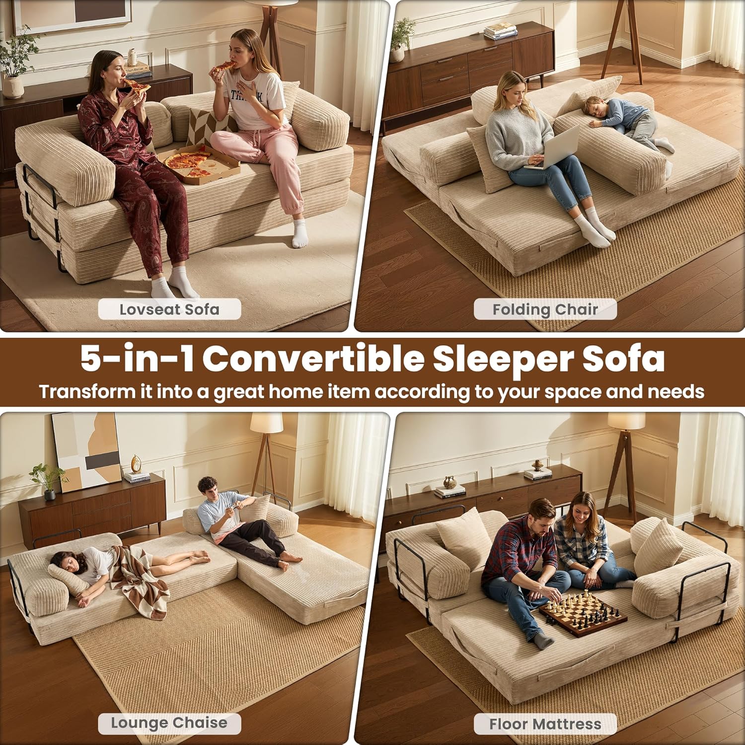 • 81" Folding Sofa Bed, Foldable Sleeper Boneless Couch with Pull Out Beds, Modular Convertible Floor Futon Loveseat Lounger for Living Room (Corduroy, Beige)